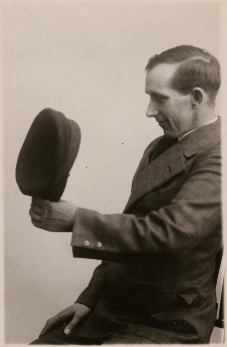 Titel: Fotografi från "Redogörelse för tillverkning vid Statens Järnvägars protesverkstad i Nässjö", 1932. Visar armprotesens rörelseförmåga och användbarhet.