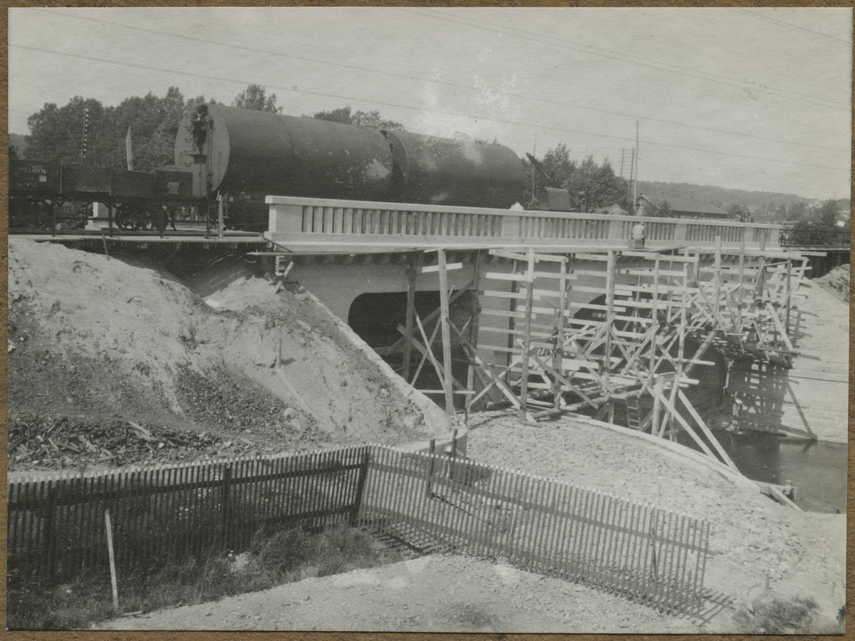 Dubbelspårsbyggnaden mellan Alingsås - Olskroken. Bron över Säveån, provbelastning. Godsvagn öppen SJ 10376. Godsvagn tank SJ.