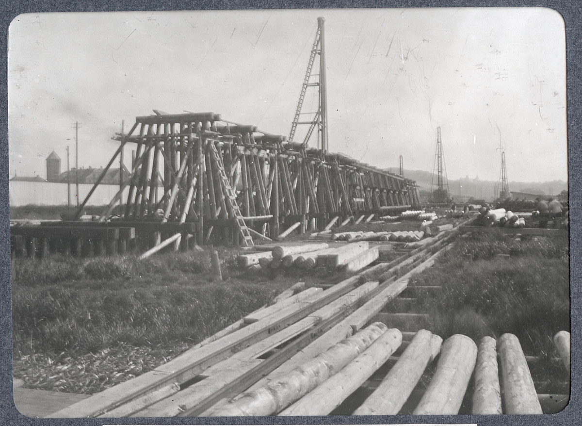 Titel: Album med fotografier från Bohusbanan. Provisorisk viadukt. Bockar under uppsättning