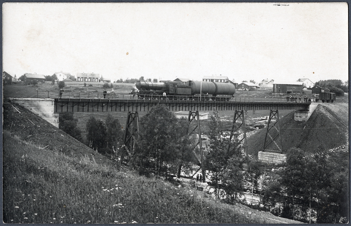 Provbelastning av bro över Billstaån på linjen mellan Sveg och Brunflo. På bron står ett E-lok med två av SJ:s Byggnadsförråds fem proprovningsvagnar litt Q9. Längst till höger syns en bostads/köksvagn med ett kaminrör stickande ut från en ventil.