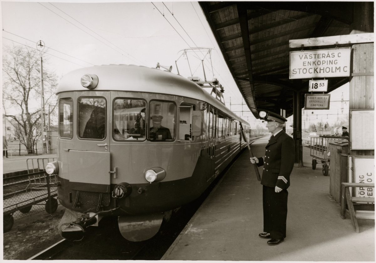 TGOJ motorvagn med lokförare vid perrong med stins.