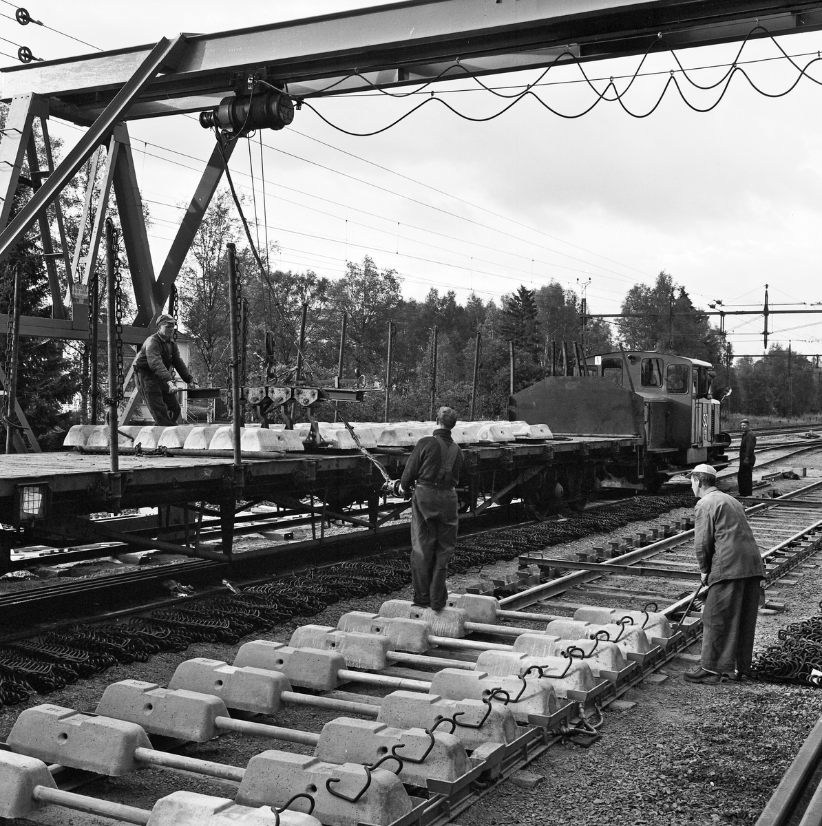 Spårarbete, Flisby-Solberga. Uttransport av färdigt spårspann. SJ Z43 199