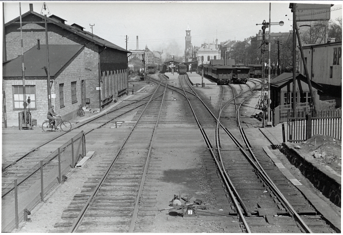 Titel: Utsikt över centralstationen med tornet av rådhuset i bakgrunden.
