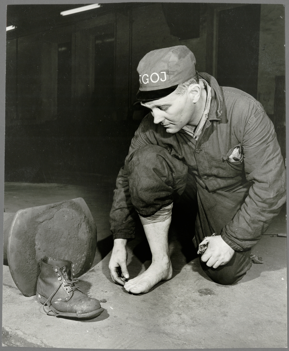 Personvagnsreparatör Einar Larsson, vid Trafikaktiebolaget GrängesbergOxelösunds Järnvägars järnvägsverkstad i Eskilstuna, demonstrerar hur skyddsskon räddade hans tår i samband med en arbetsplatsolycka då en 150 kilos buffert föll ner på hans fot.