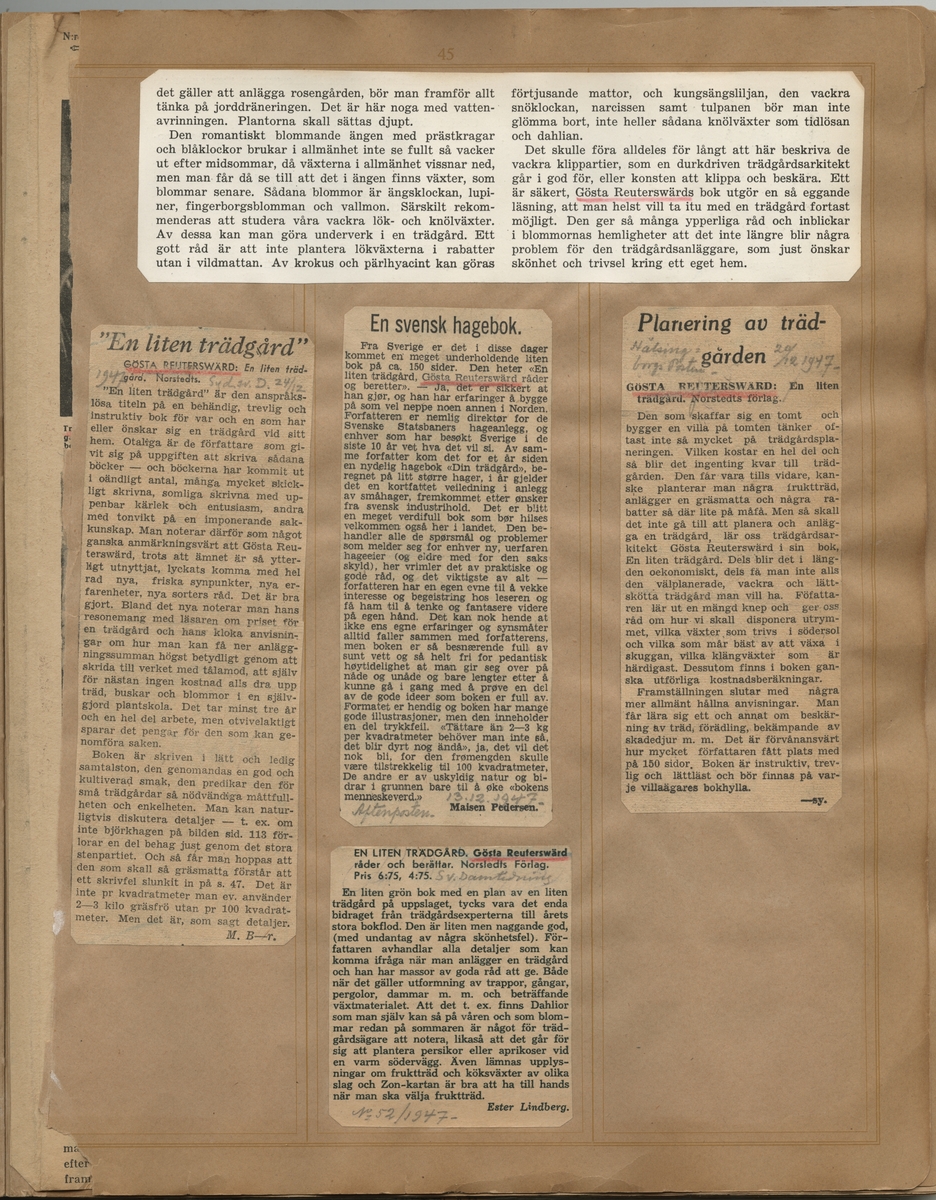 Tidningsklipp ur "Uppsatser om trädgårdar m.m. som på ett eller annat sätt beröra Gösta Reuterswärd. Samlade av Ernst Hj."