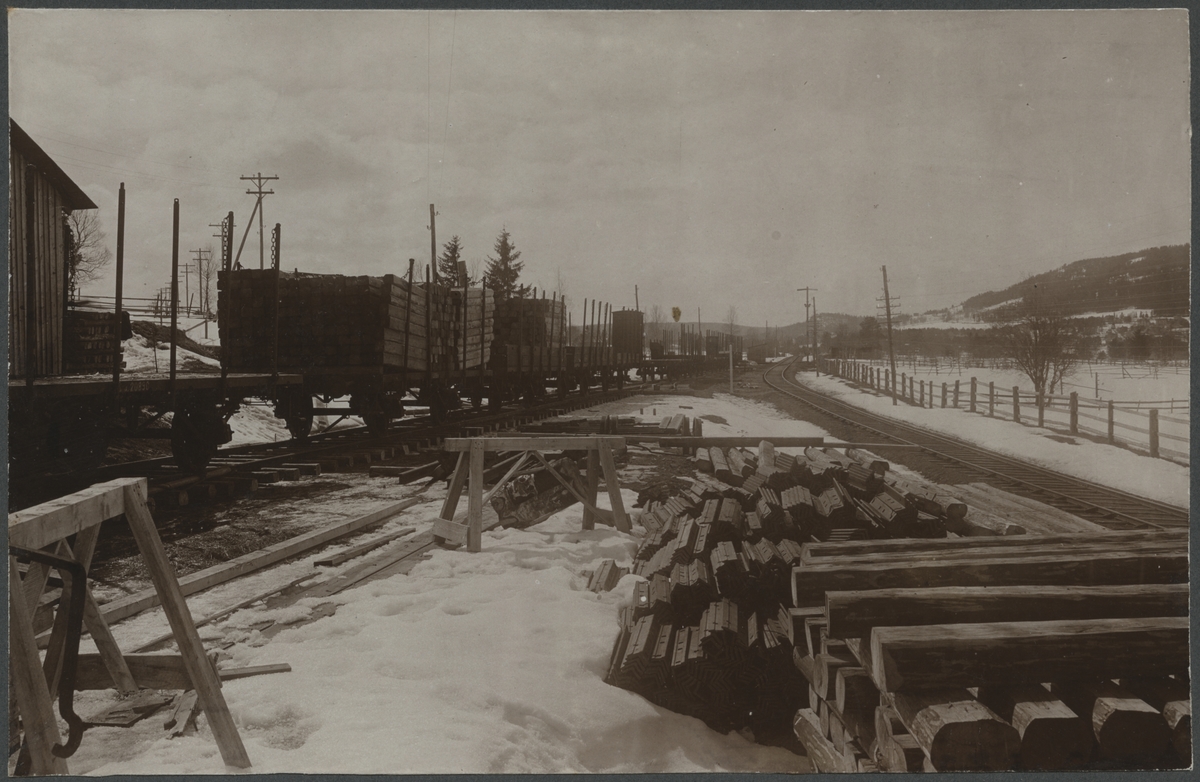 Statens Järnvägar, SJ banbyggnad. Inlandsbanan delen Lungvik - Häggenås. Bilden visar anslutningen till linjen Östersund - Storlien. Vagnarna står på den blivande inlandsbanedelen vilken togs i bruk 1911-10-10.