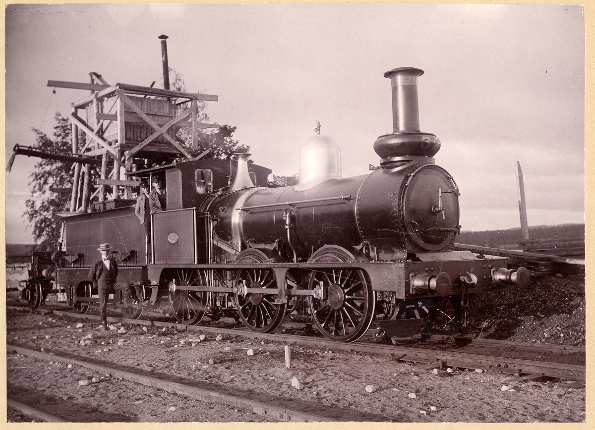 SWB D/K 32 i Söderbärke 1900. Nedanför loket okänd civil person.