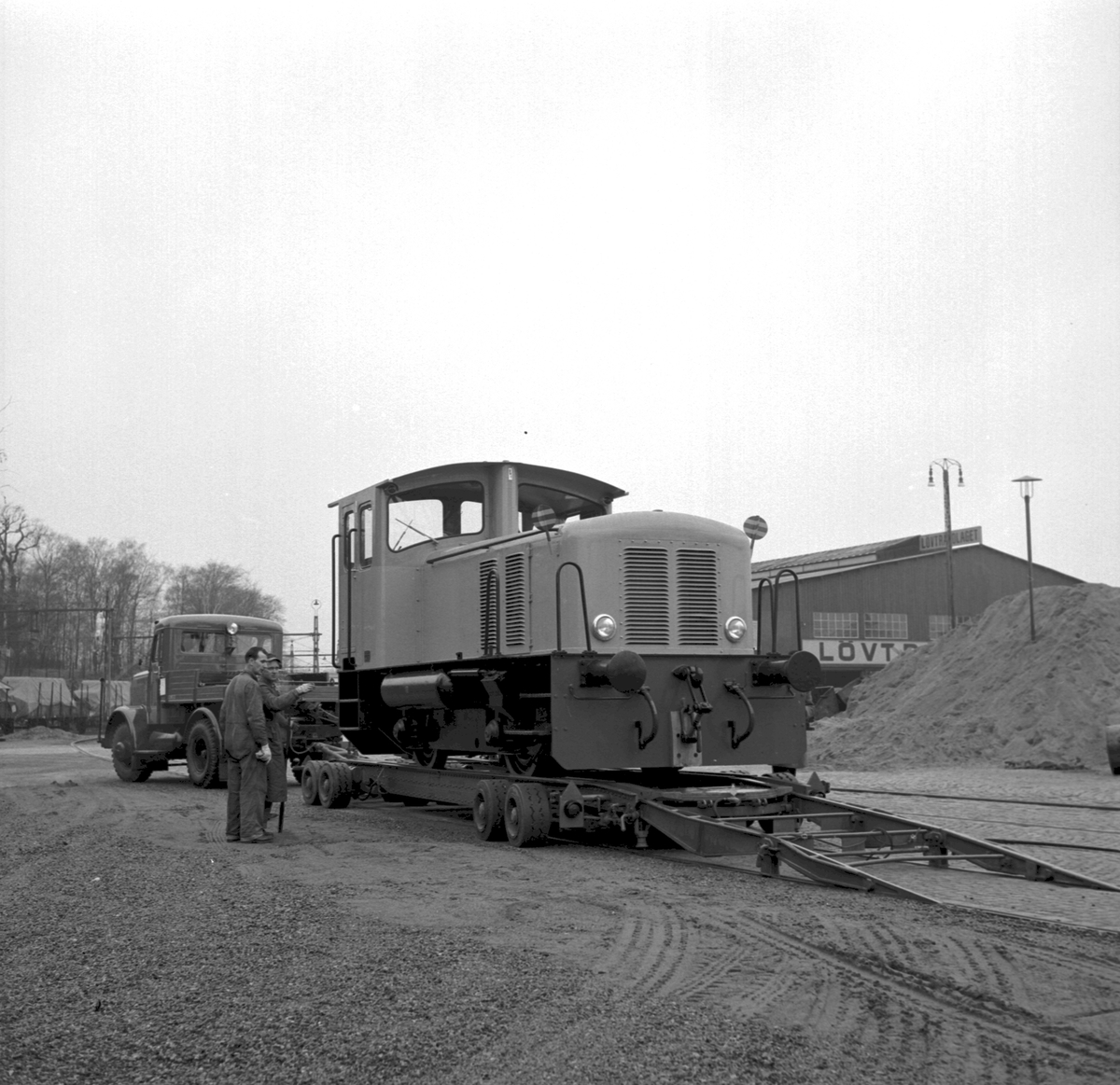 Vagnbjörntransport av lokomotor Statens Järnvägar SJ Z, från Aktsiebolaget Svenska Järnvägs verkstäder, vid Värtan station inför
