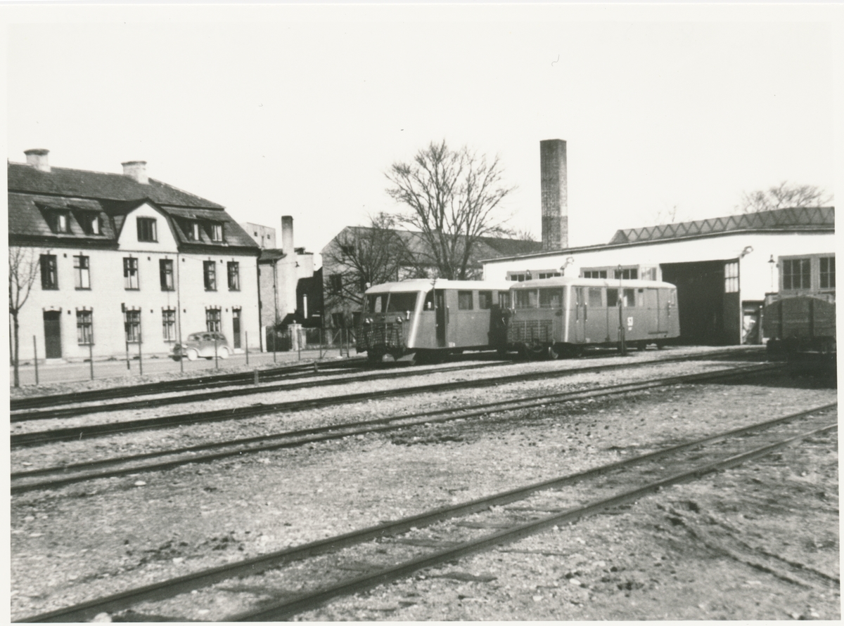 Rälsbussar utanför garaget. Visby station öppnad öppnad 1878 av Gotland Järnvägar, GJ. Då byggdes tvåvånings stationshus i sten. Nytt magasin uppfördes 1912. Rälsbussgarage med fyra portar byggdes 1945. GJ förstatligades 1947. Den allmänna trafiken lades ned 1960. Enskild godstrafik i Visby Andelsslakteris regi bedrevs på sträckan Slakteriet-Visby hamn fram till maj 1962.