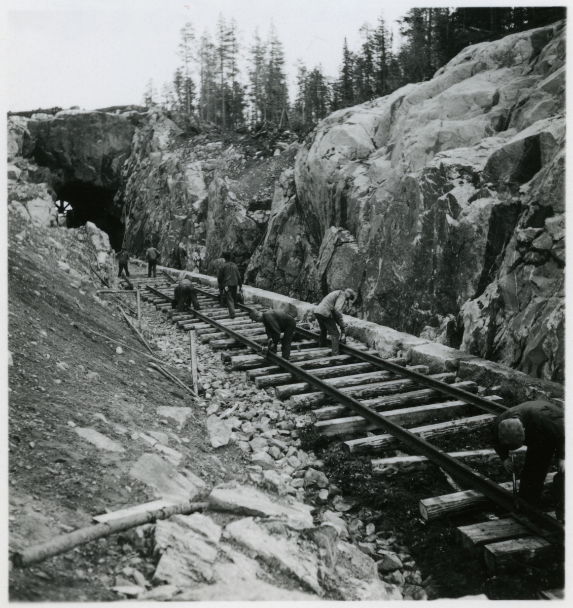 Rälsläggning vid inlandsbanans enda järnvägstunnel, strax utanför Jokkmokk. Sträckan Sorsele - Jokkmokk.