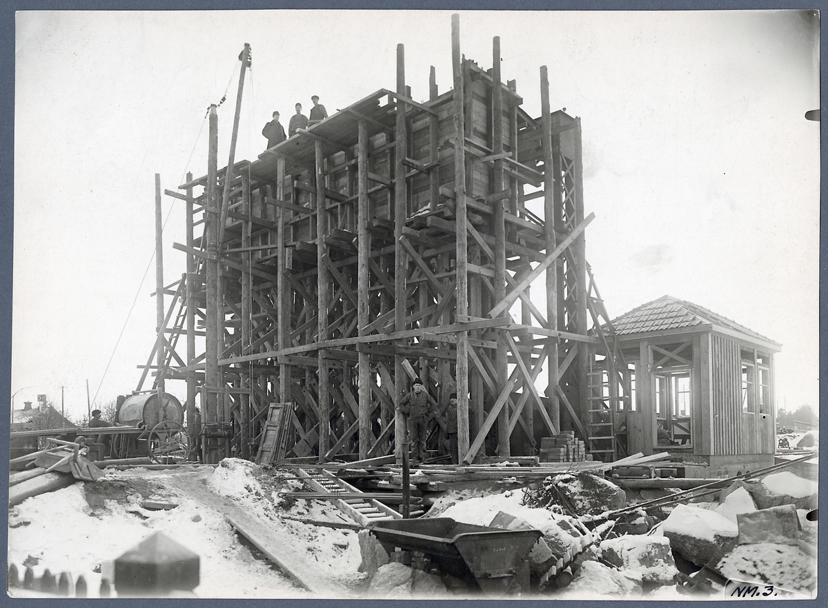 Uppförandet av manöverhuset och motvikten för järnvägsbron över Göta älv vid Norsholm på linjen mellan Norrköping och Linköping.