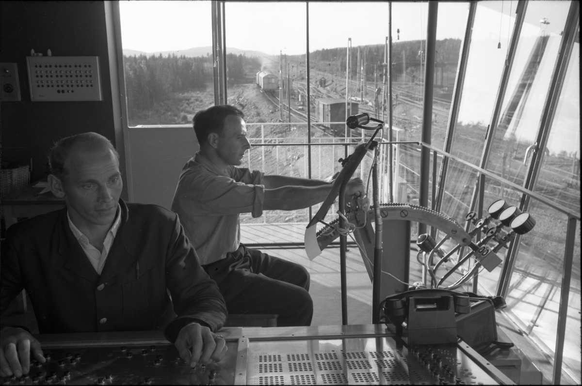 Rangertornet på rangerbangården på Ånge station Personal vid ett elektriskt ställverk och vid en automatisk växelomläggningsmaskin.