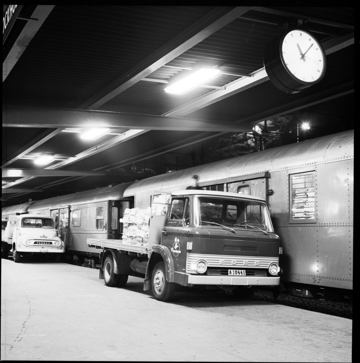 Tidningslastning Pressbyrån, mellan lasbil och för sortering / buntning ombyggda person - resgodsvagnar.