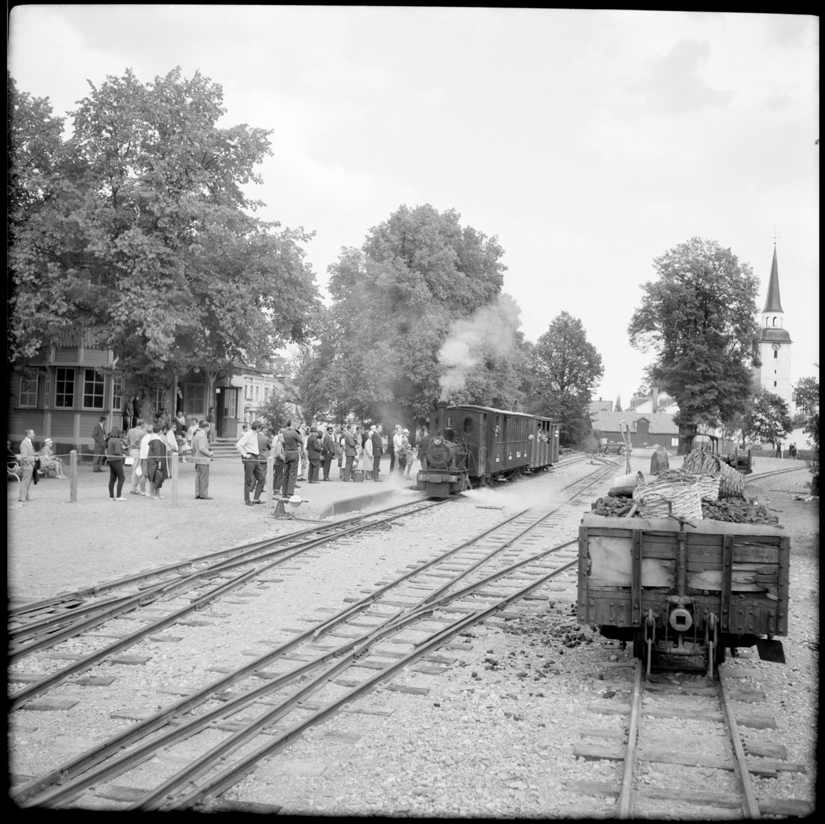 Resande till Museijärnvägen, Östra Södermanlands Järnväg, ÖSlJ vid ångtåget med lok 2 "Lotta" på stationen i Mariefred. Kolvagn till höger i bild.