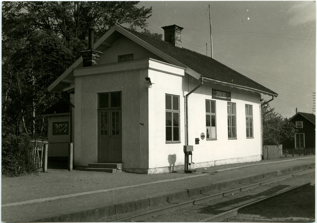 Stationshuset vid Ryningsnäs med tilliggande vevställverk.19 maj 1875 kunde stationen öppnas för allmän trafik och då flyttade även posten dit. 1909 byggdes det till en tillbyggnad samt 1913 gjordes ett mindre ekonomi hus . Ny plattform anlades mellan 1930-1932. 1939 gjordes en stor rust av hela stationshuset. Stationen avbemmandes helt den 1 juni 1975.