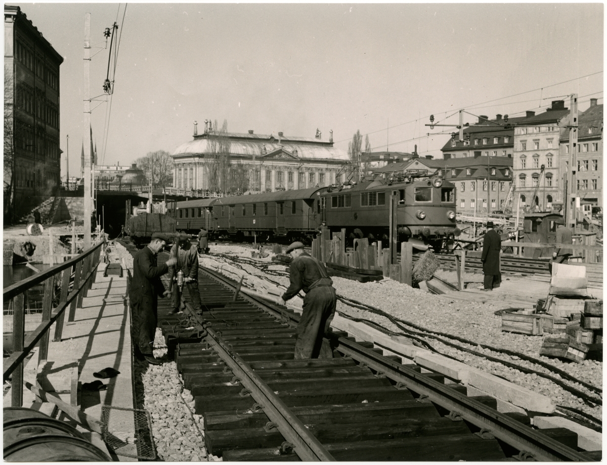 Titel: Statens Järnvägar SJ F 621. Bro och spårarbeten på linjen mellan Stockholm C och Stockholm S.