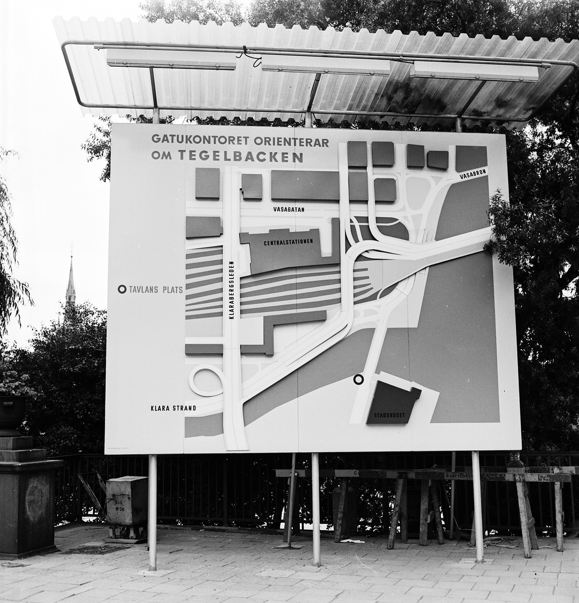 Origenteringstavla över Tegelbacken och södra delen av Stockholm Central. Kyrktornet till vänster i bild tillhör Klara kyrka.
