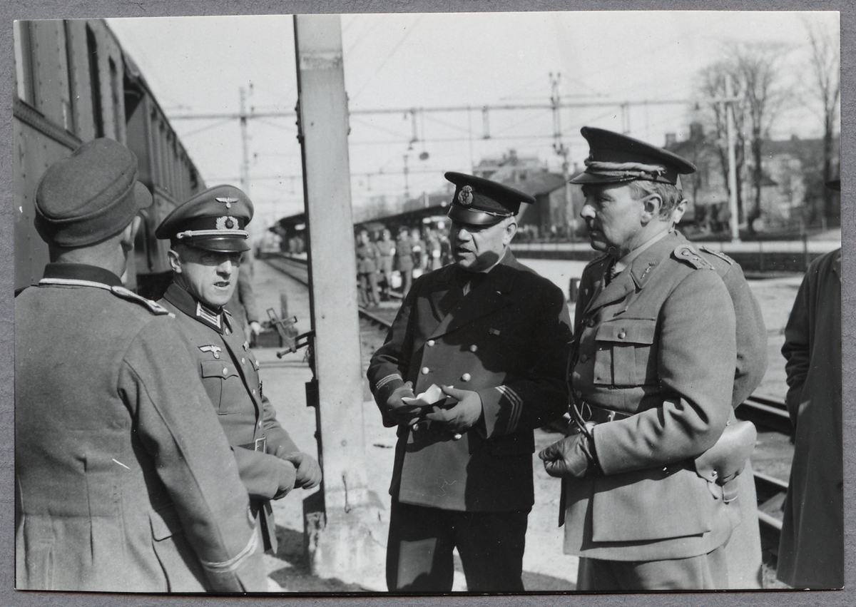 Svenska militära befäl samt en svensk polis och tyska militära befäl i samspråk på Hallsbergs station under Andra Världskriget. Detta i samband med att ett tyskt sjukvårdståg stannat på stationen. Polisen i mitten av bilden är Överinspektör Linell.