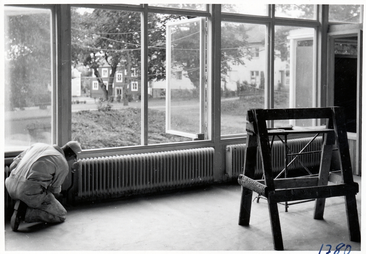 Titel: Radiatorlack läggs på under byggnaden av Sigtuna busstation.