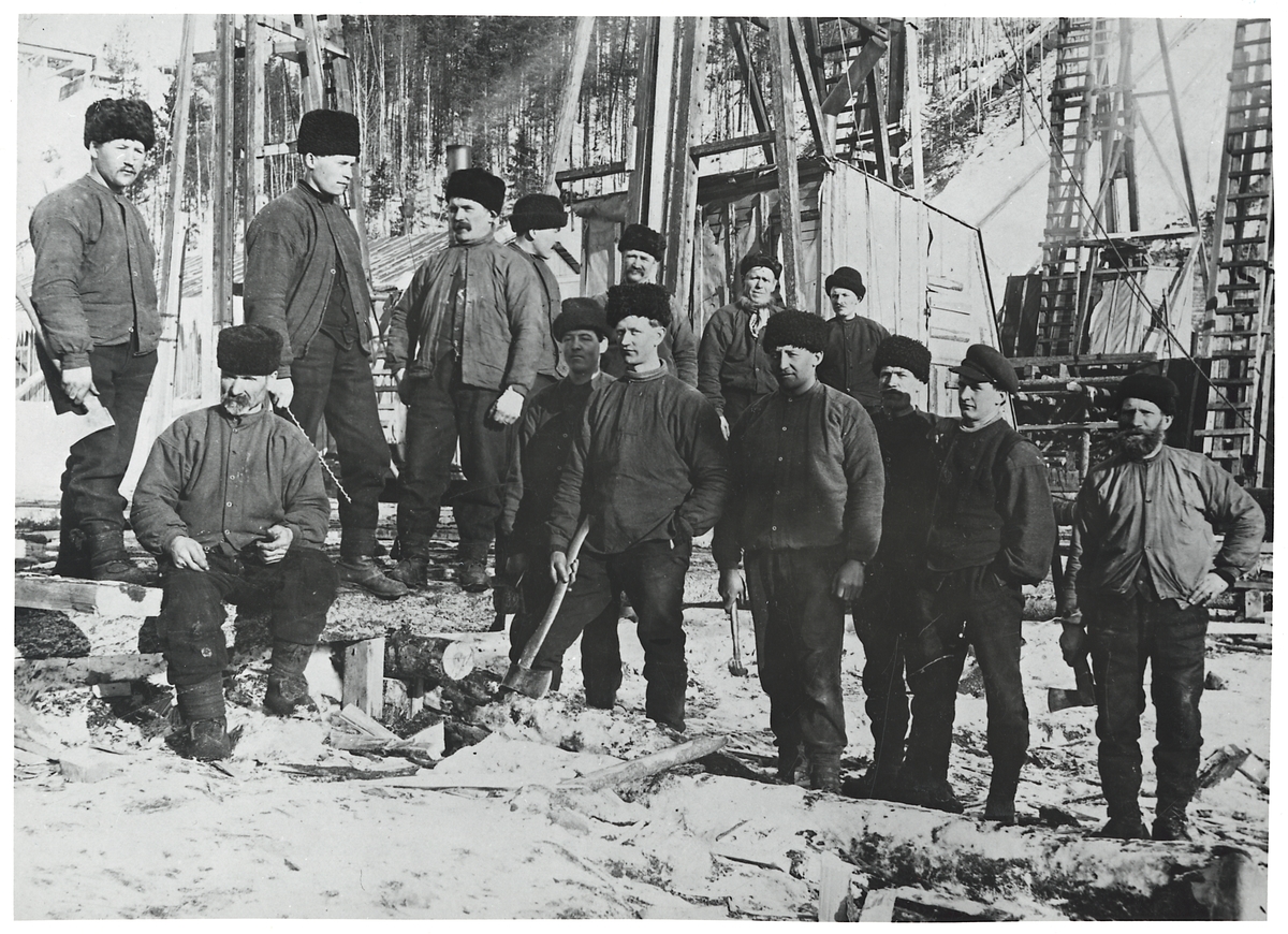 Titel: Snickarlag vid ställningsbron vid brobygget över Öreälven 1917.