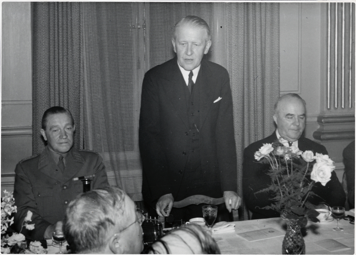 Överbefälhavare Helge Jung och Generaldirektör Gustaf Dahlbeck med flera på invigningslunchen i Västerås.