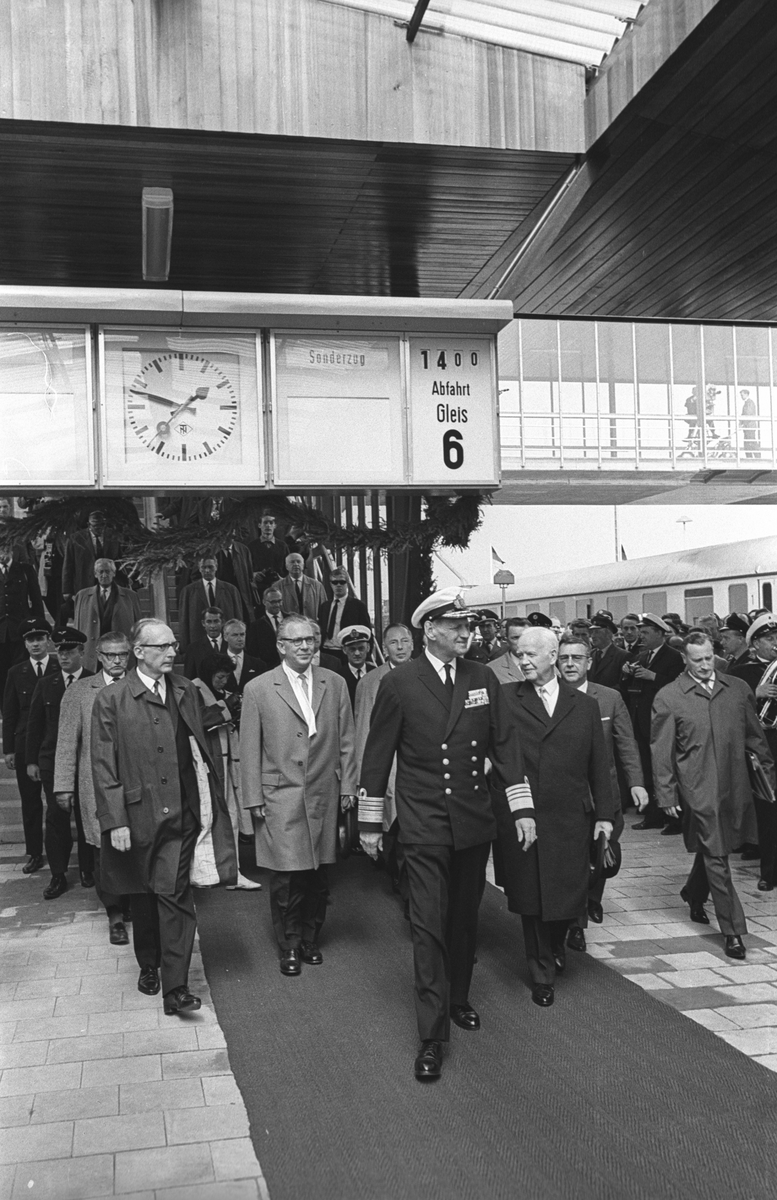 Invigning av "Fågelvägslinjen" mellan Rodbyhavn, Lolland, Danmark och Puttgarden, Fehmarn, Tyskland. Den nya färjelinjen kallas "Fågelvägslinjen", på danska Fugleflugtslinien och på tyska Vogelflugslinie, eftersom linjen följer flyttfåglarnas flygrutt. Danmarks kung Frederik IX, främst