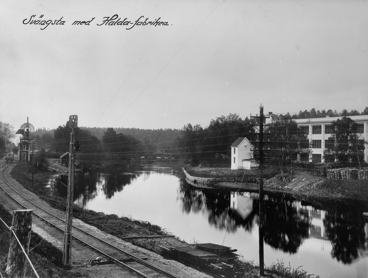 Svängsta med Halda fabriken vid Mörrumsån. Svängsta station skymtar till vänster bakom vattentornet. Bilden är tagen i riktning mot Karlshamn.