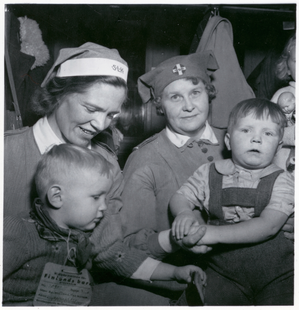 Transport av barn från Finland i samband med barnevakueringen under kriget. Här med lottor.