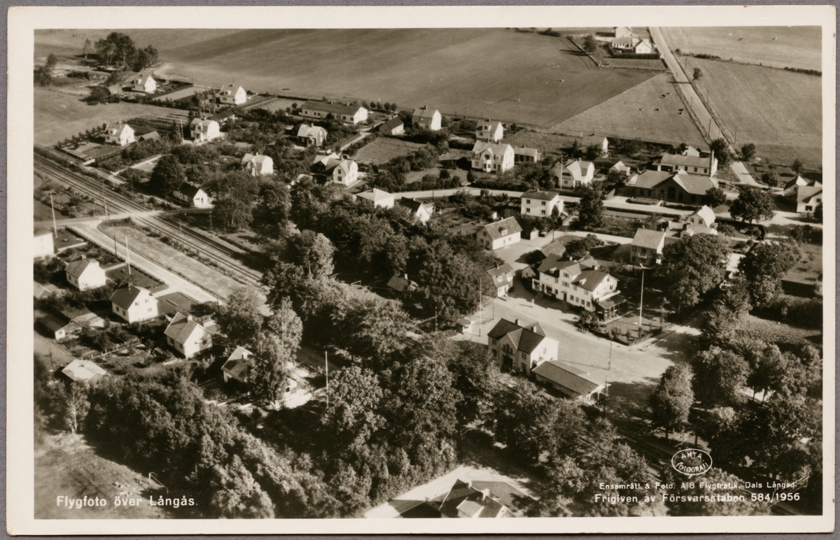 Flygfoto på samhälle med järnväg och jordbruk i bild.