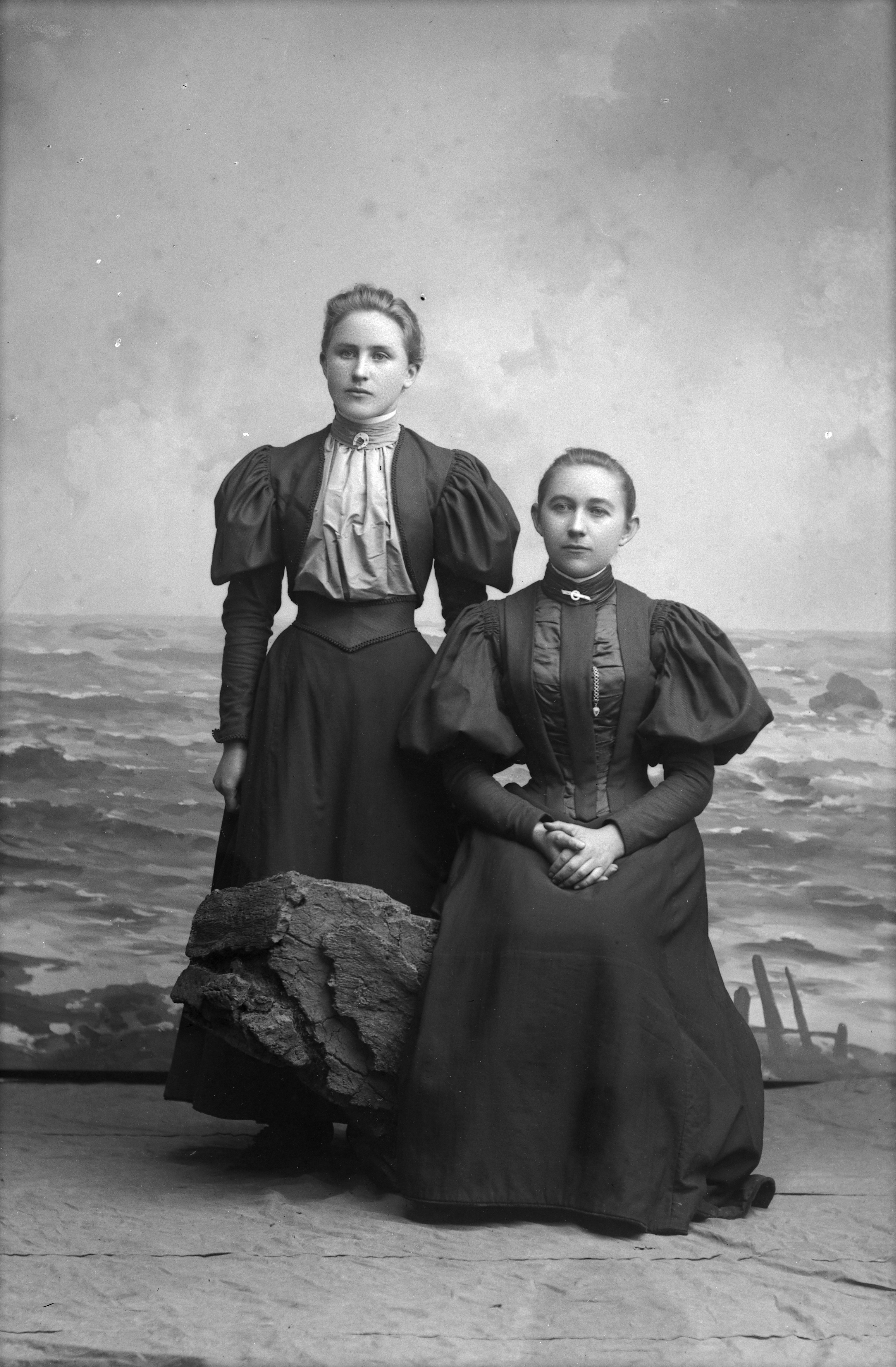 Porträtt i helfigur av Sofia och Carolina Nilsson, stående invid ateljéfond med havsmotiv.