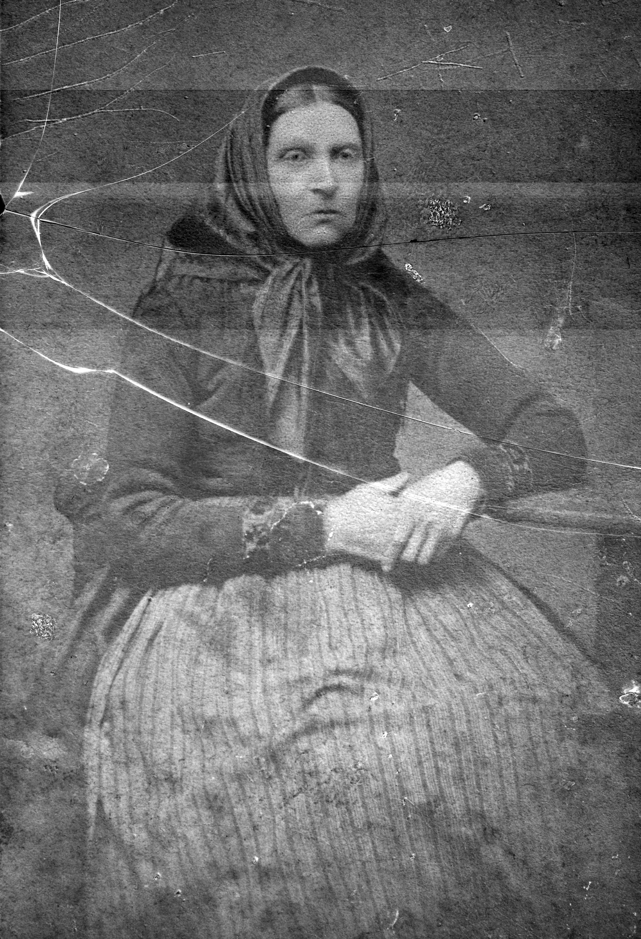Beskrivning: Porträtt i helfigur av oidentifierad kvinna.
