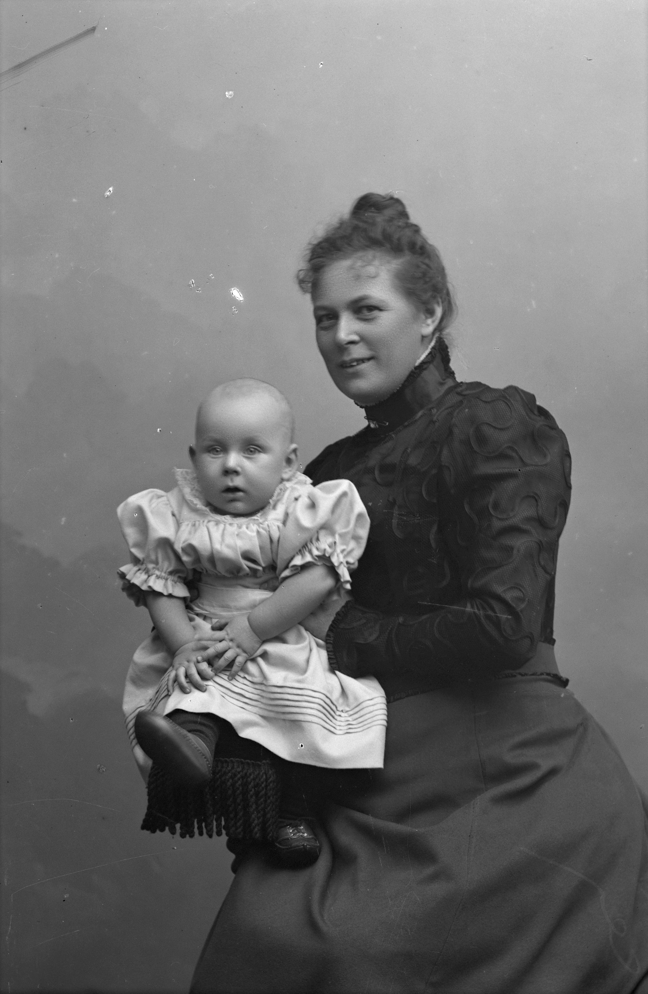 Beskrivning: Porträtt i helfigur av fru Lindahl med sitt barn i famnen.