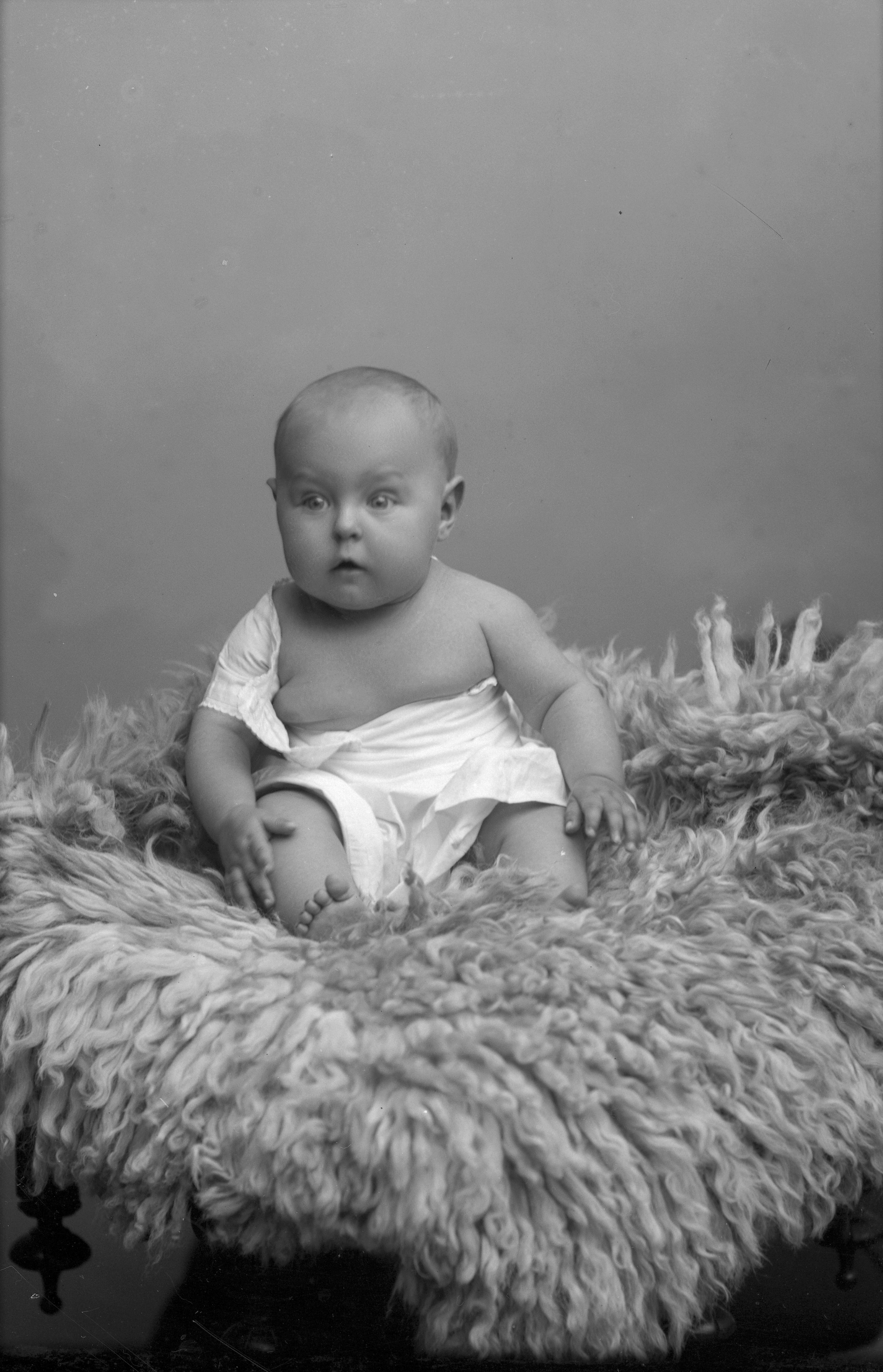 Porträtt i helfigur av Perssons barn, sittande på fäll.