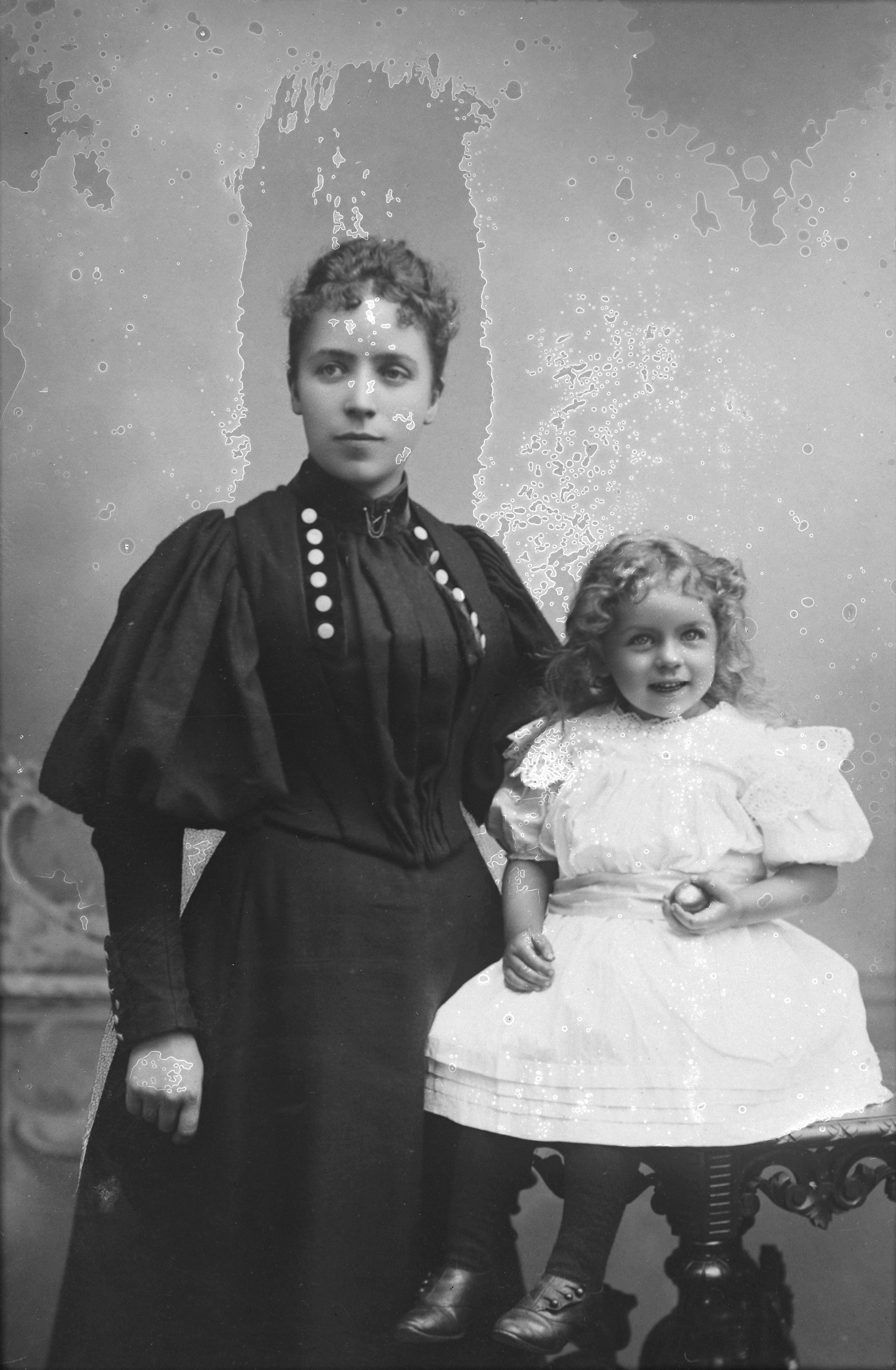 Beskrivning: Porträtt i helfigur av fru Sjögren med dotter.