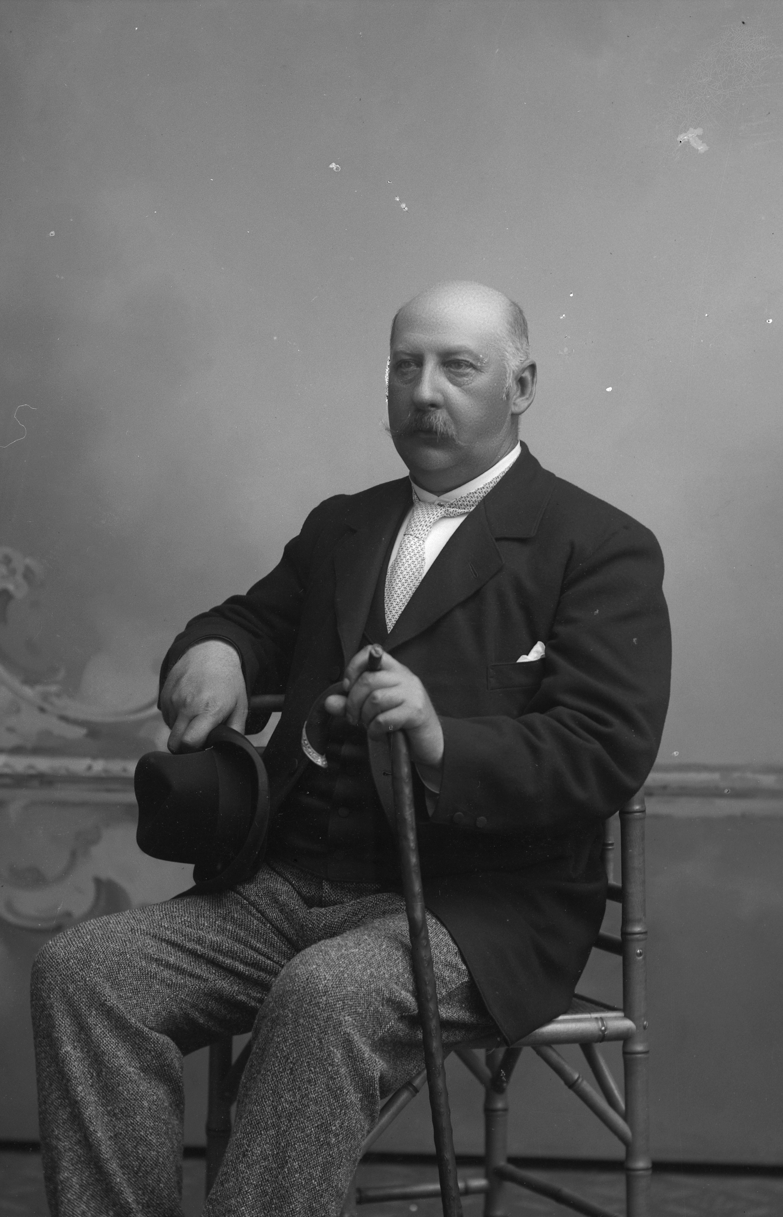 Porträtt i helfigur av A. O. Andersson, sittande, hållande hatt och käpp.