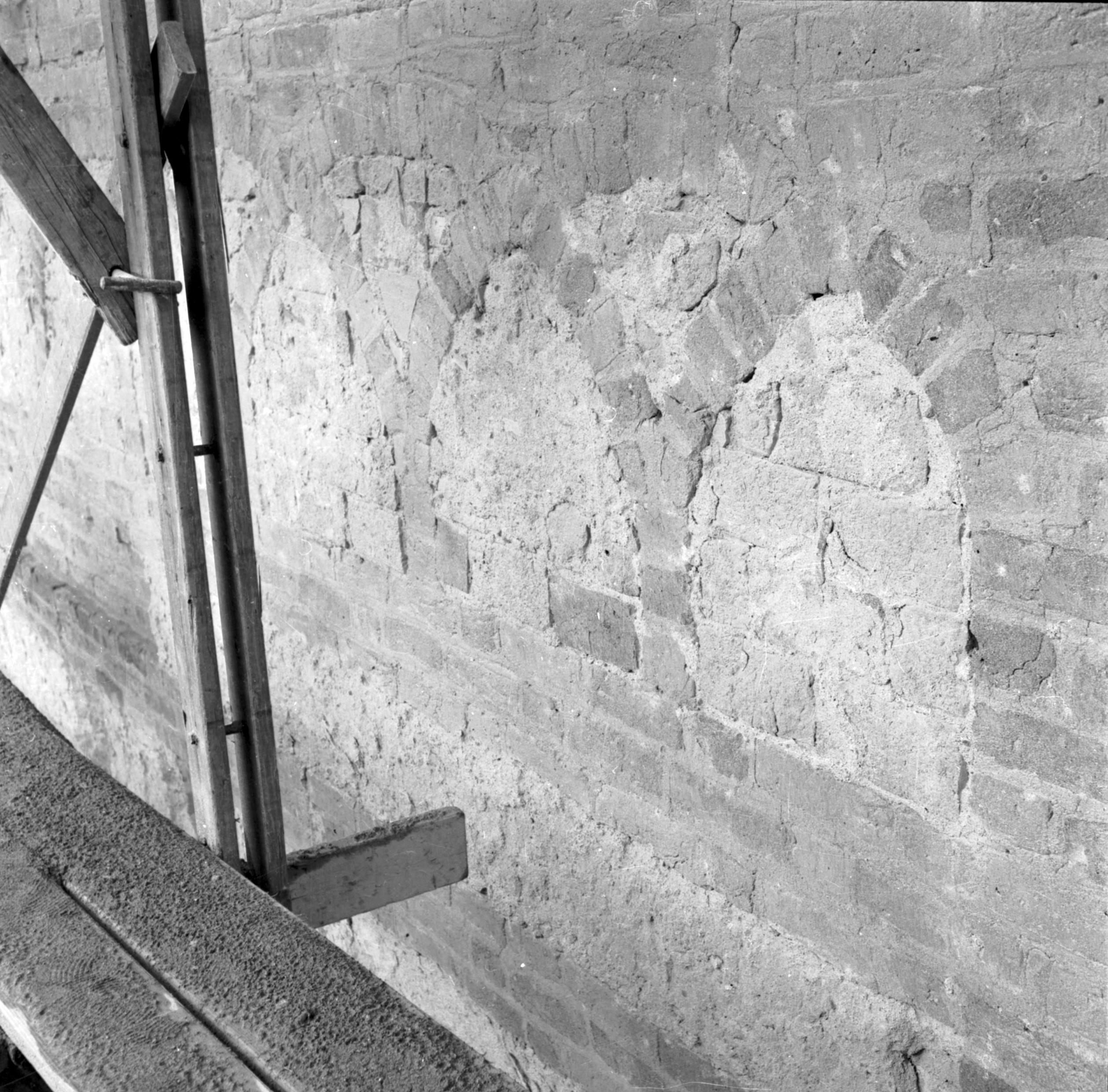Blinderingsbanden på tornets västra sida fotograferade i ordning uppifrån och nedåt. Byggnadshistorisk undersökning i samband med omputsning 1963. Foto nr. 19.