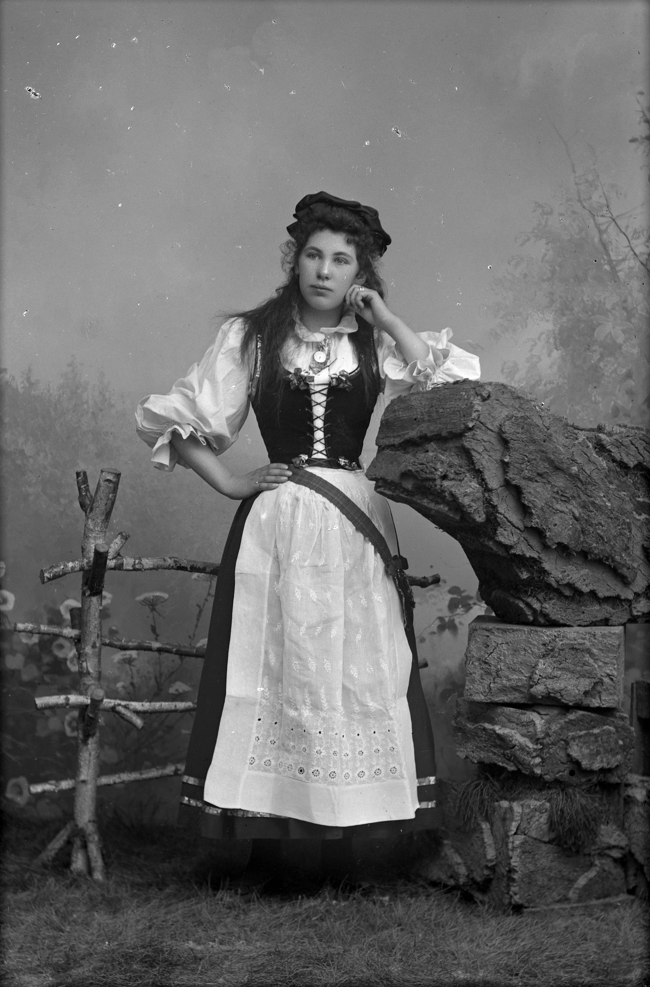 Porträtt i helfigur av Anna Andersson, iklädd folkdräkt, stående vid staket, vilande armbågen mot stenhäll. Fotograferad framför ateljéfond.