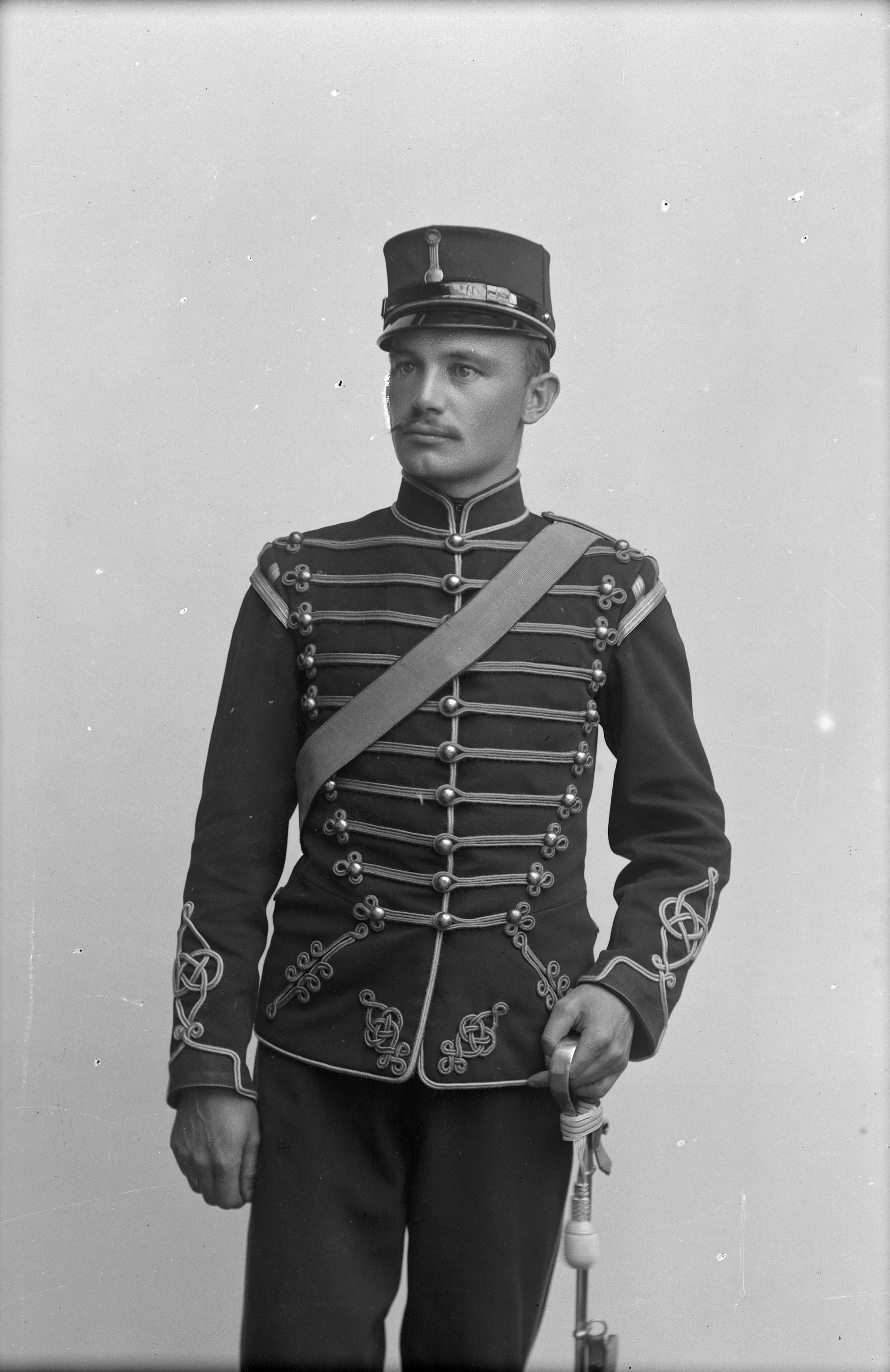 Porträtt i helfigur av sergeant Svensson, iklädd militäruniform och mössa, hållande sabel.