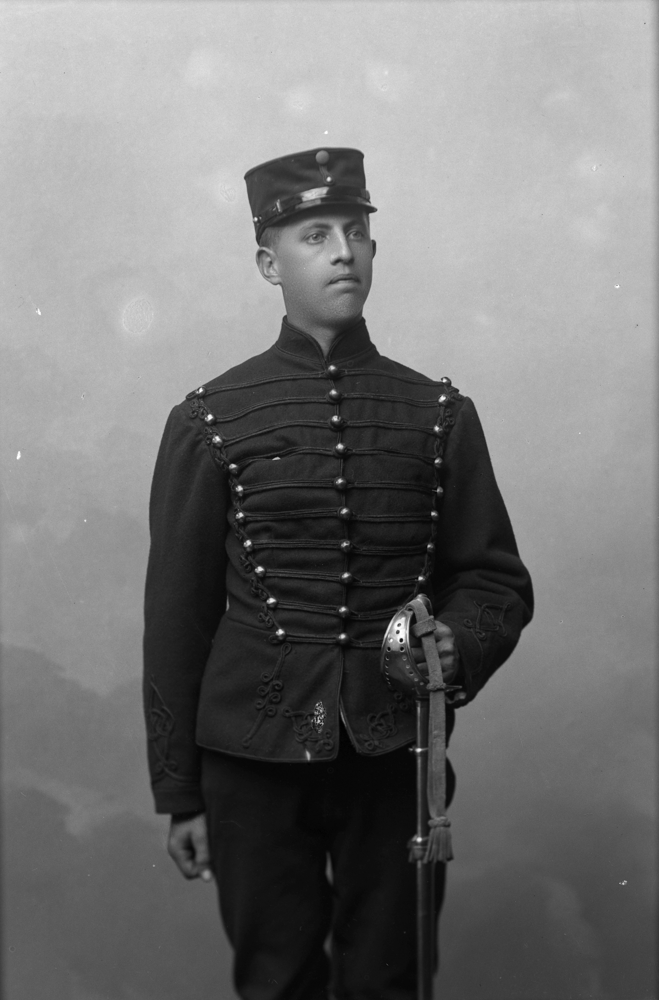 Porträtt i helfigur av A. Andersson, iklädd militäruniform och -mössa, hållande sabel.