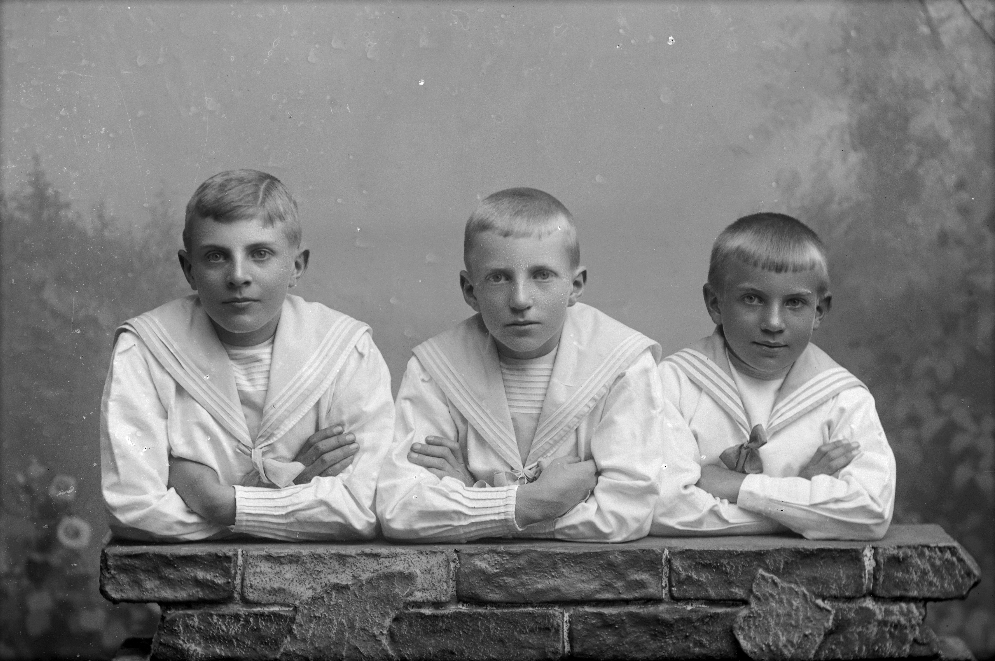 Porträtt i halvfigur av Ekmans söner, iklädda sjömanskostymer, stående vid tegelmur.