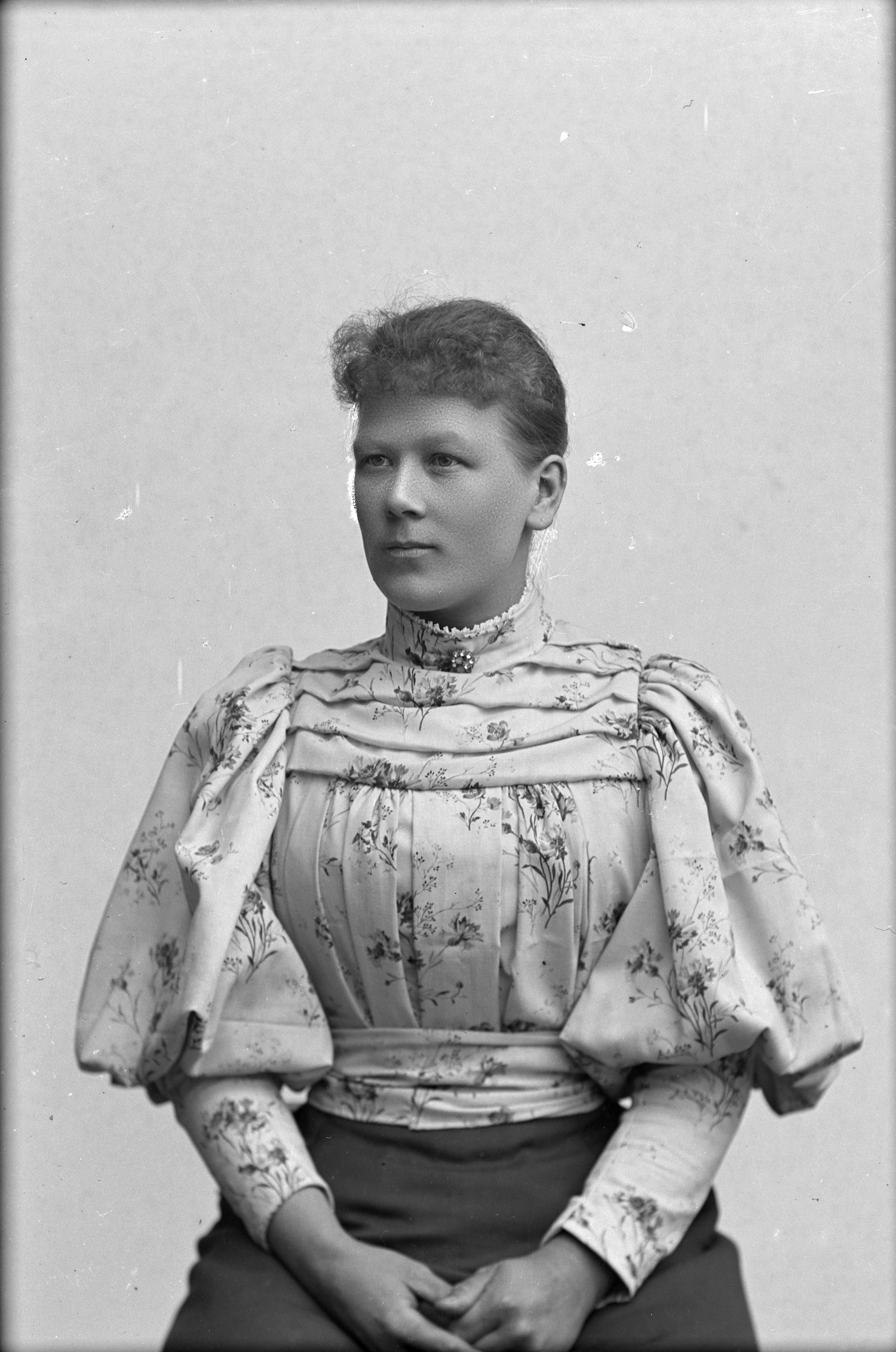 Beskrivning: Porträtt i halvfigur av Emma Björk vid Vellinge Gästgivaregård.