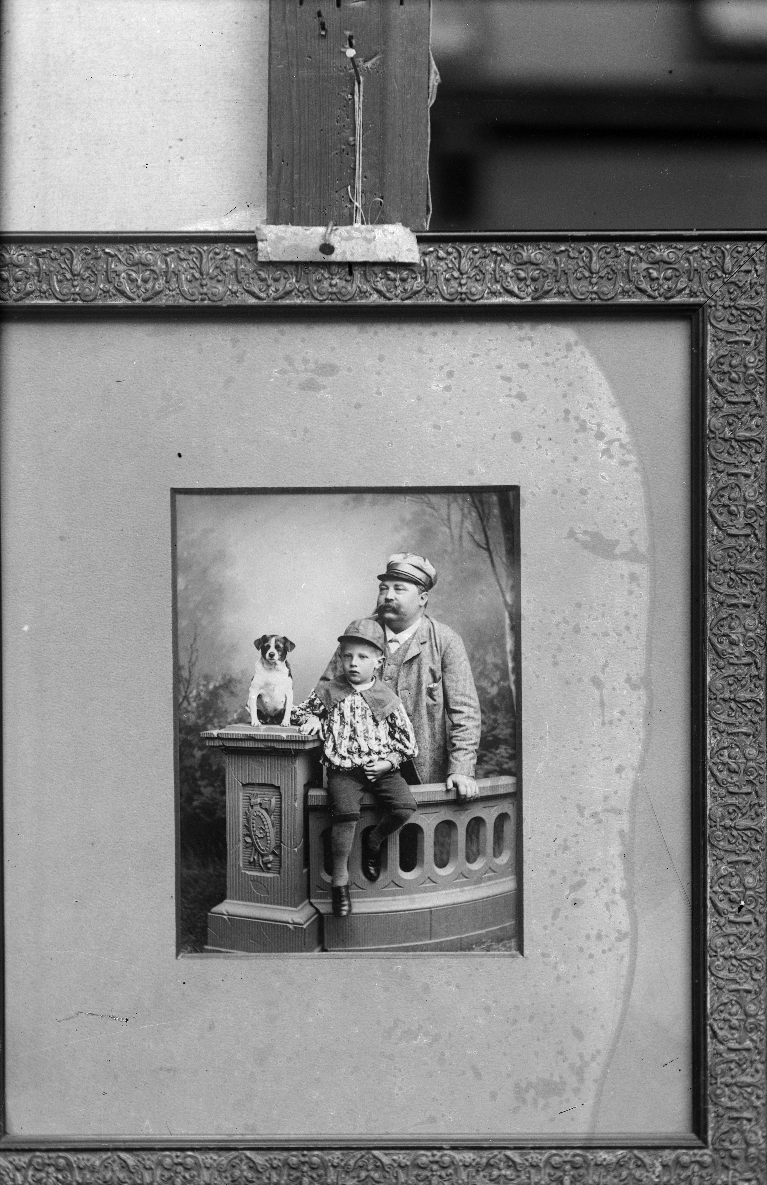Beskrivning: Porträtt i helfigur av oidentifierad man och pojke med hund.