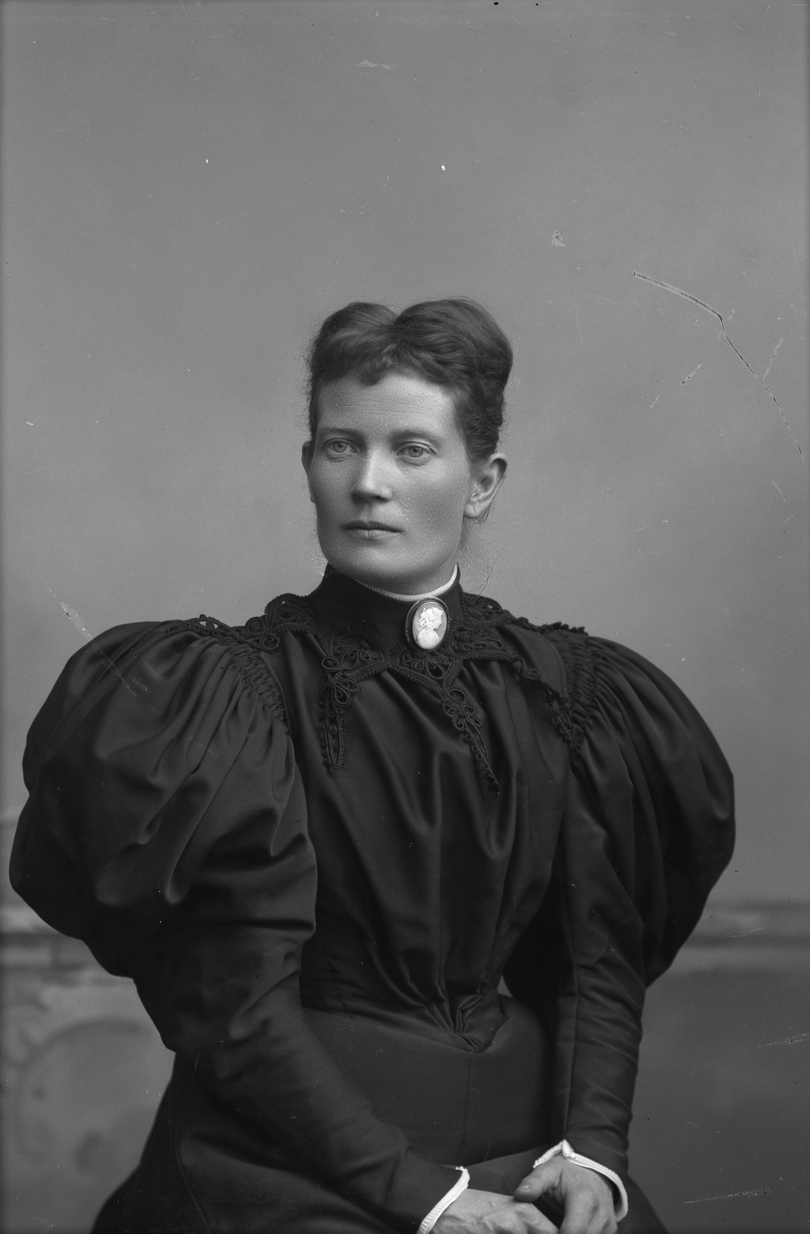 Porträtt i halvfigur av Eugenia Böök, piga vid järnvägen.