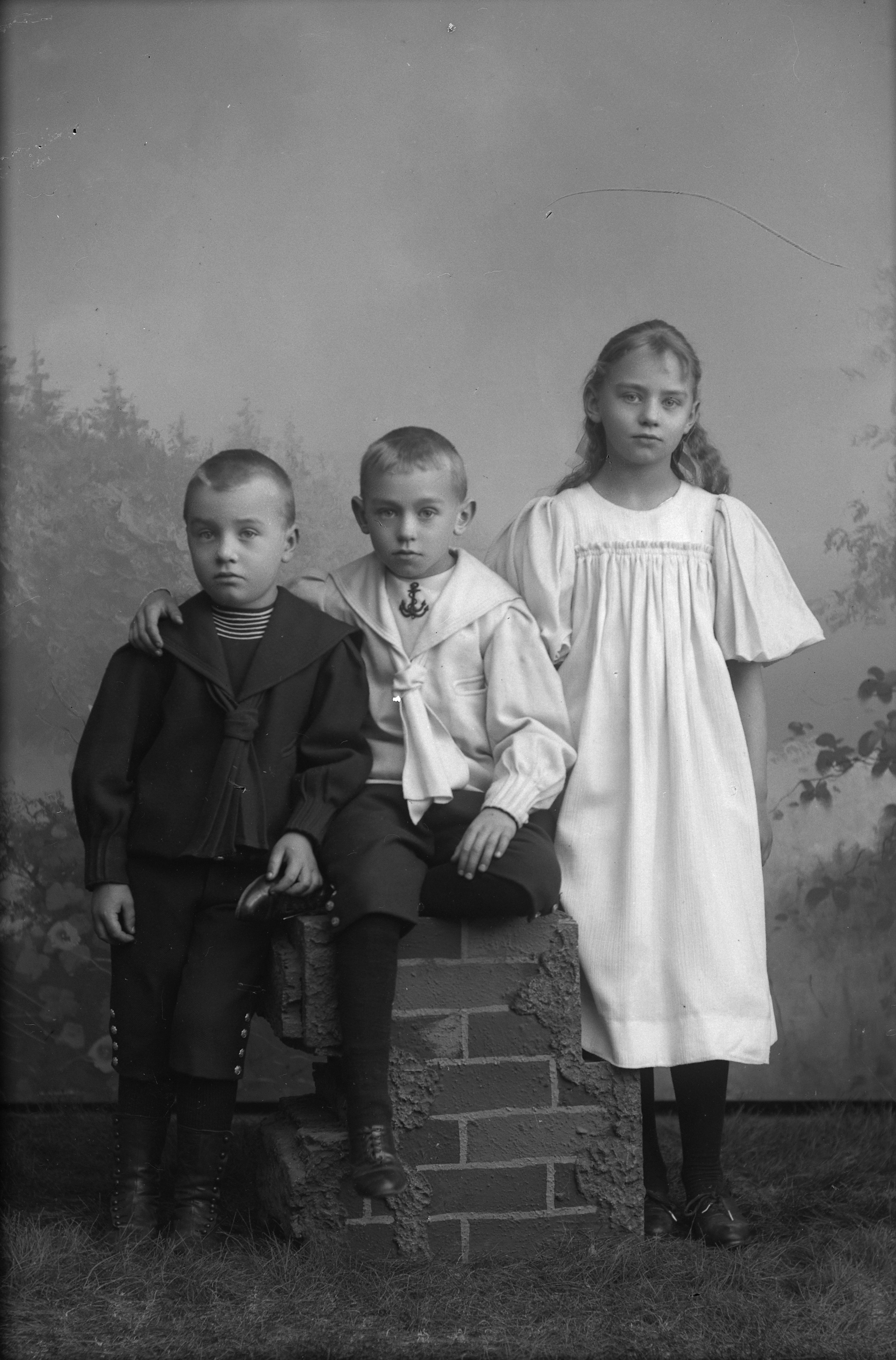 Porträtt i helfigur av fru Malmgrens söner och dotter.Sönerna iklädda sjömanskostym, sittande på tegelmur.