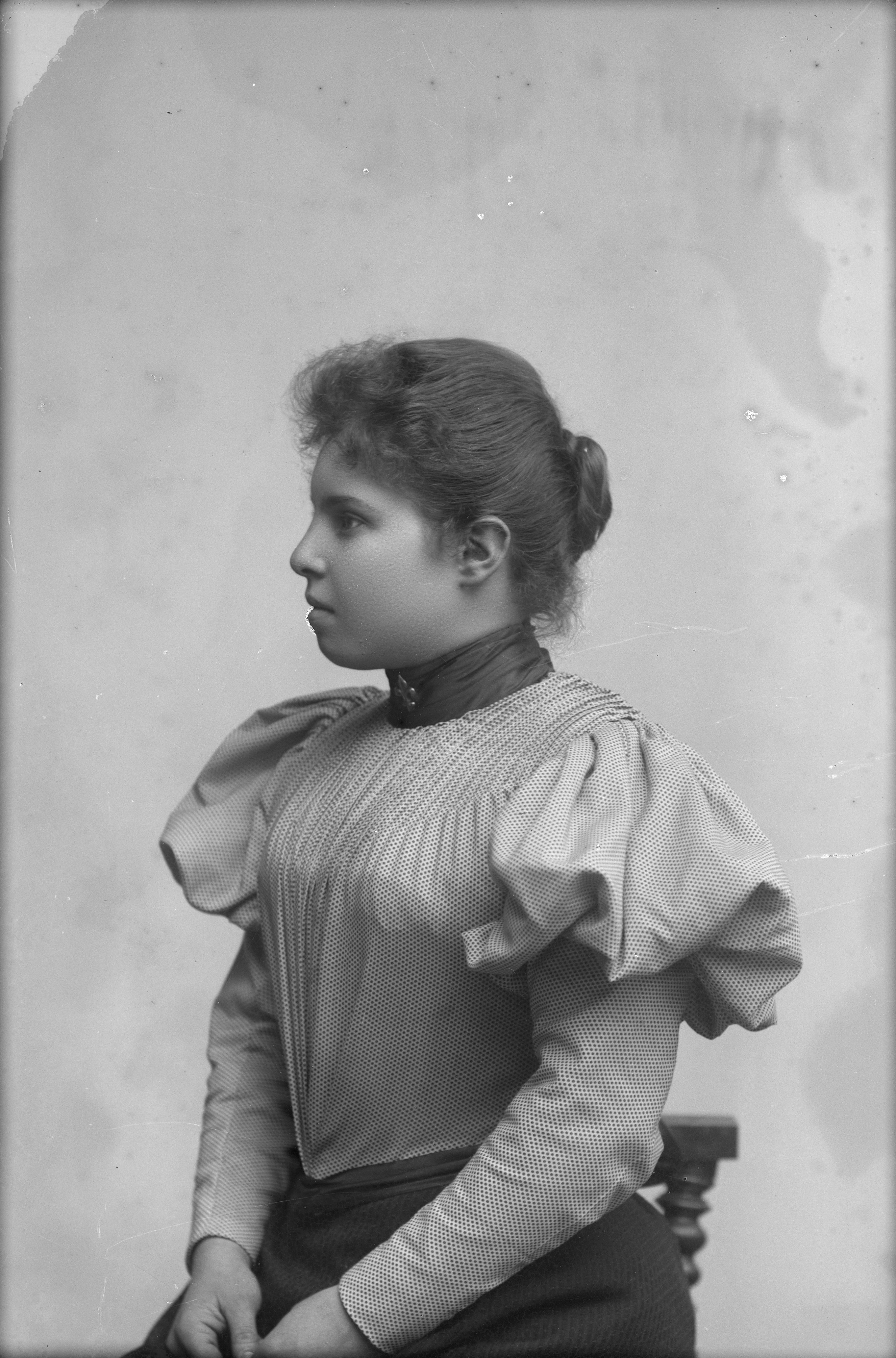 Porträtt i halvfigur av handelsbiträdet Betty Malmström, ansikte i profil.