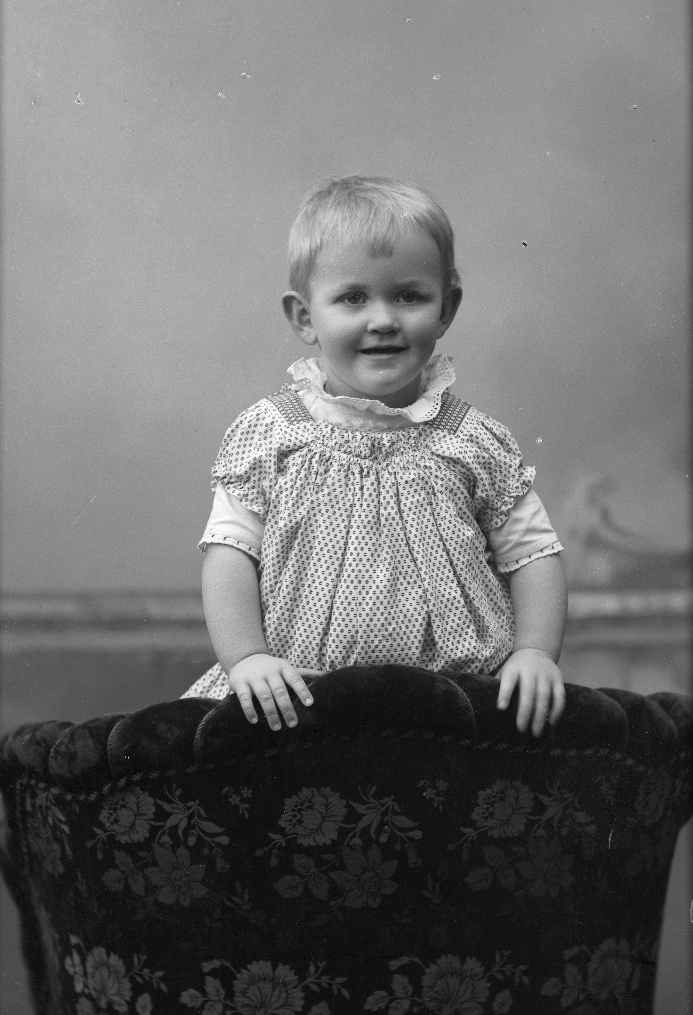 Beskrivning: Porträtt i helfigur av baron Krusenstiernas dotter, stående på stol.
