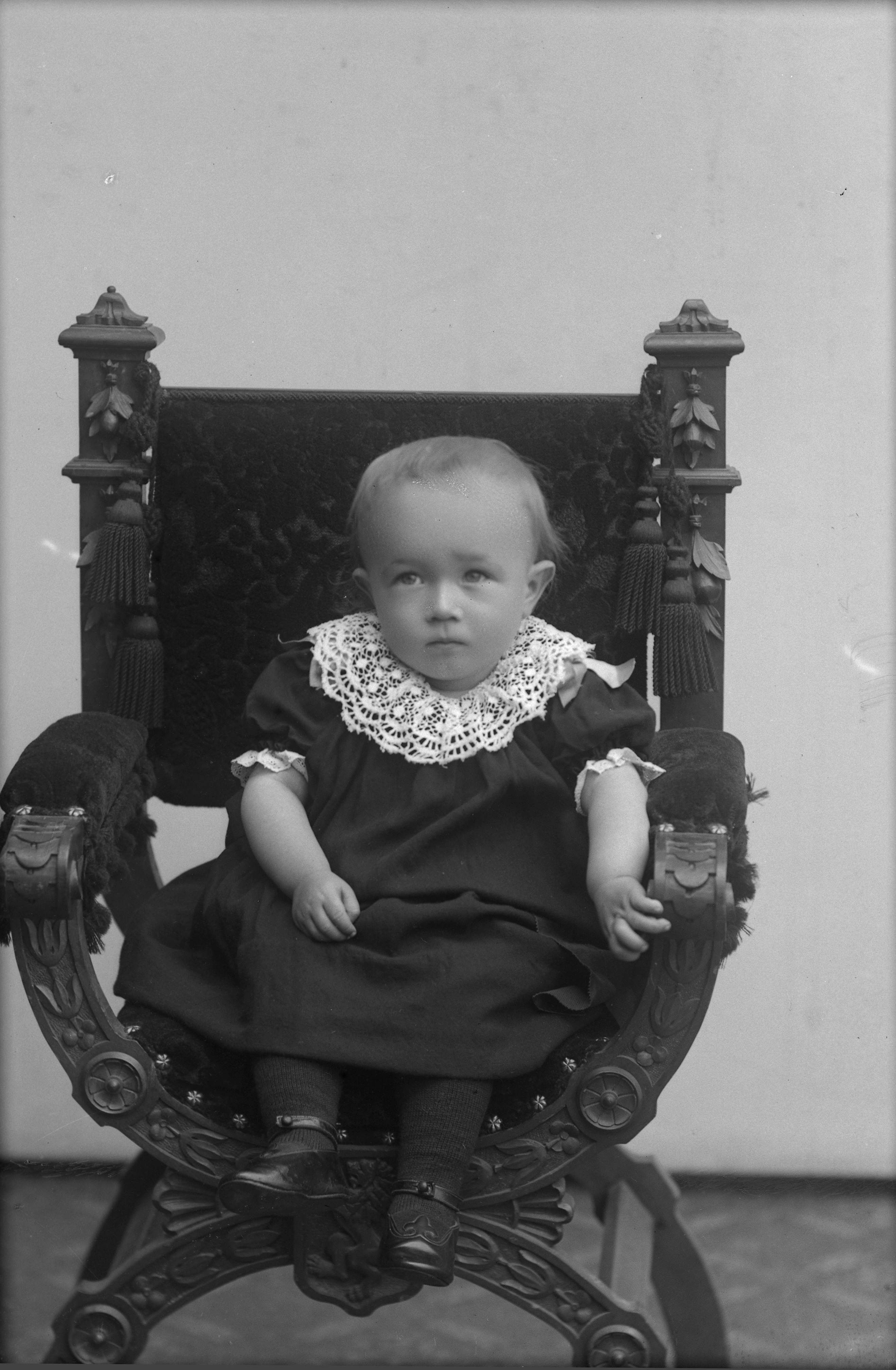 Porträtt i helfigur av Jönssons son, sittande i munkstol.