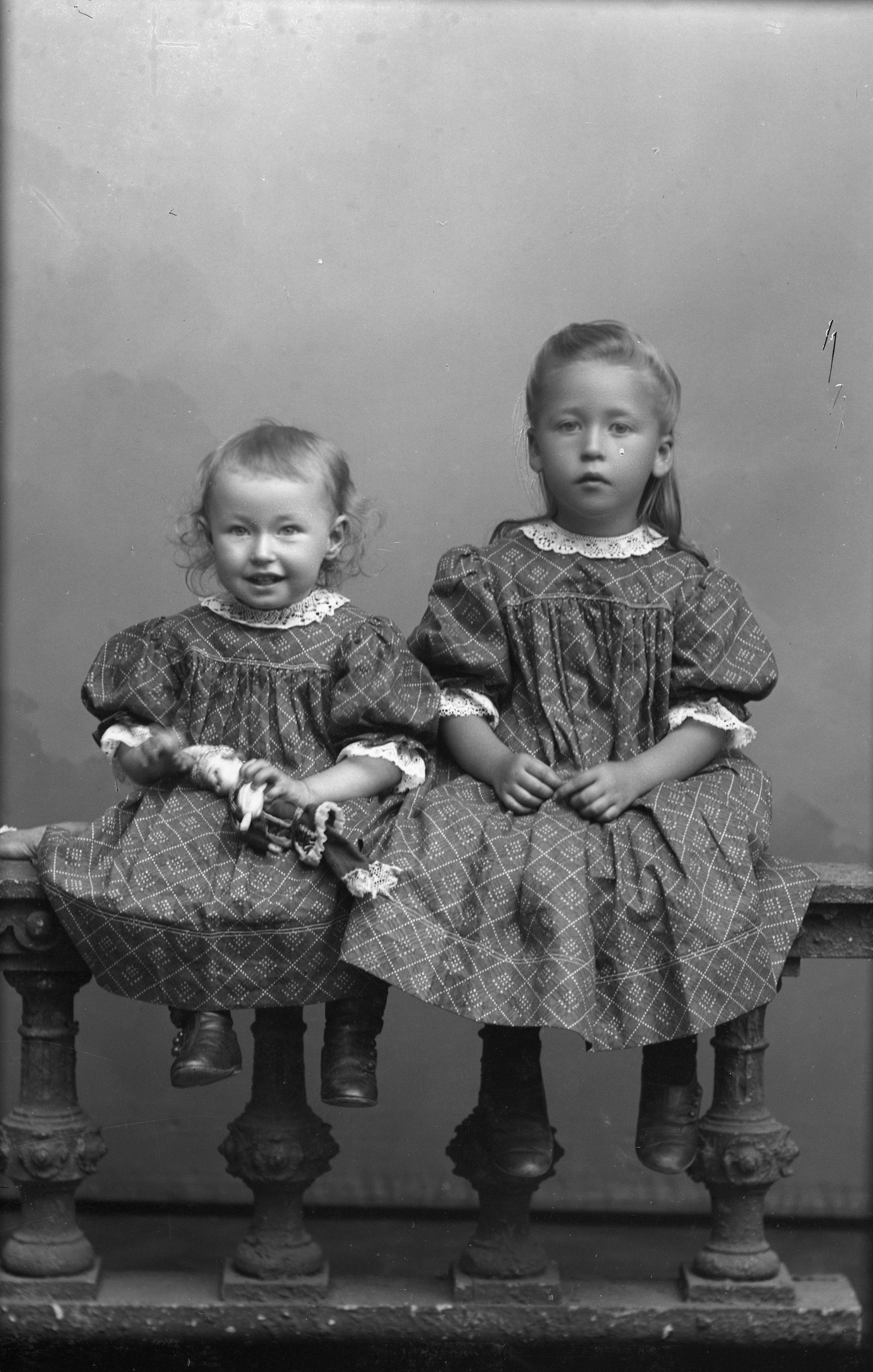Porträtt i helfigur av Hoffs döttrar, sittande på stenstaket.