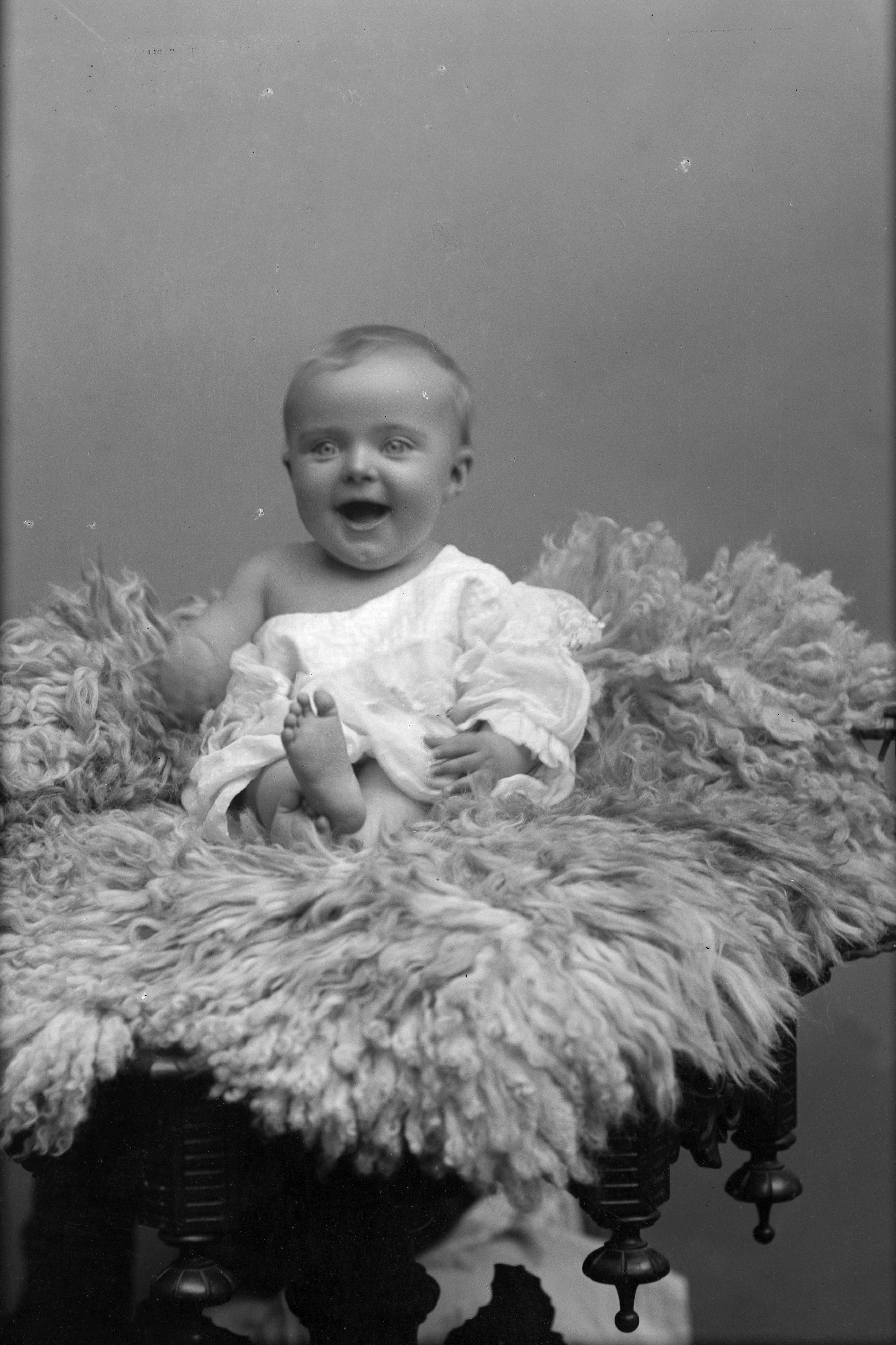 Porträtt i helfigur av Lundblads dotter, sittande på fäll.