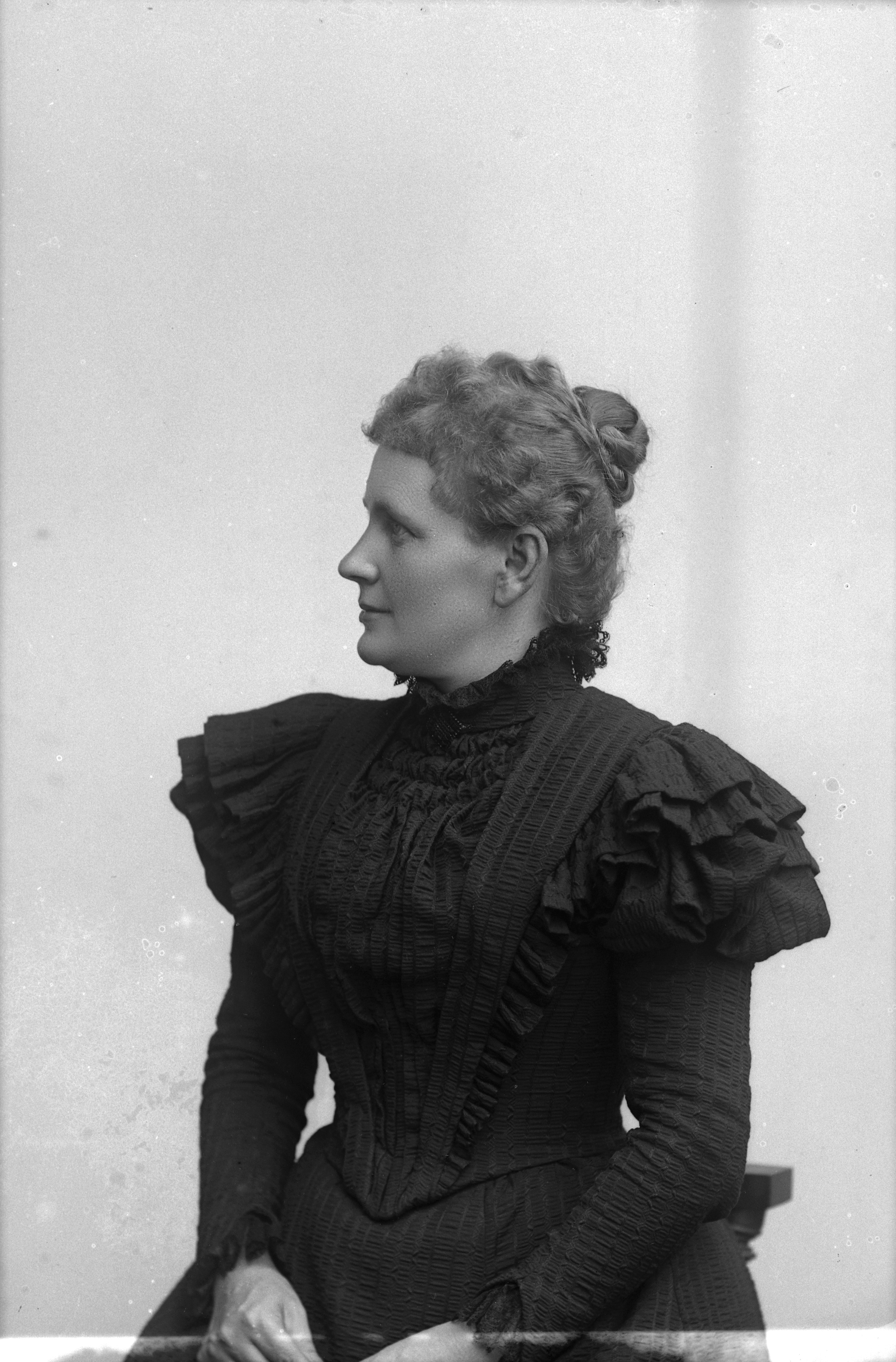 Porträtt i halvfigur av fru Liljedahl, ansikte i profil.